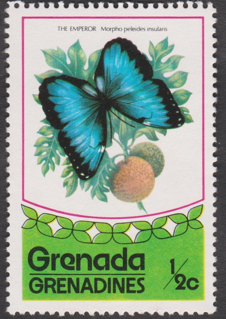Grenada GRENADINES MiNr. 79 erschien am 12.08.1975 in einem Satz zum Thema "Schmetterlinge" und zeigt "Morpho peleides insularis":