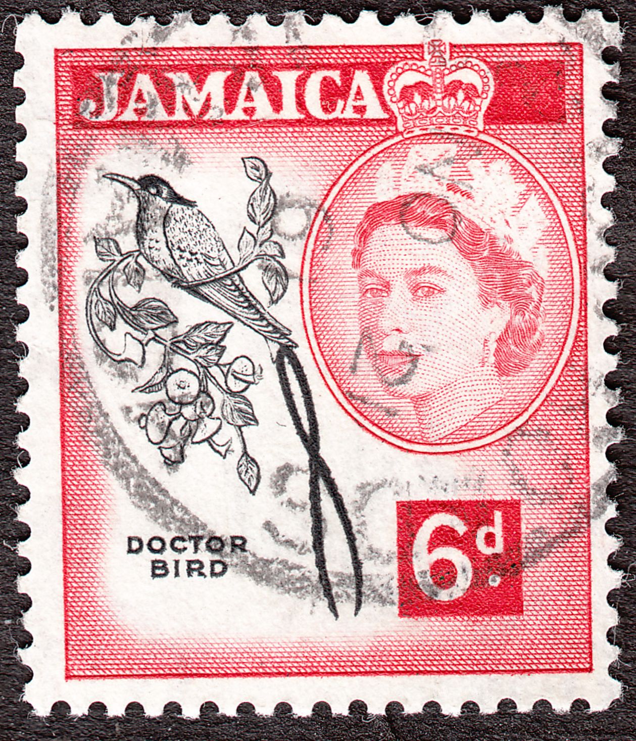 Diese Freimarke, Jamaika MiNr. 168, zeigt Königin Elisabeth II. sowie einen "DOCTOR BIRD" = Wimpelschwanz = Trochilus polytmus: