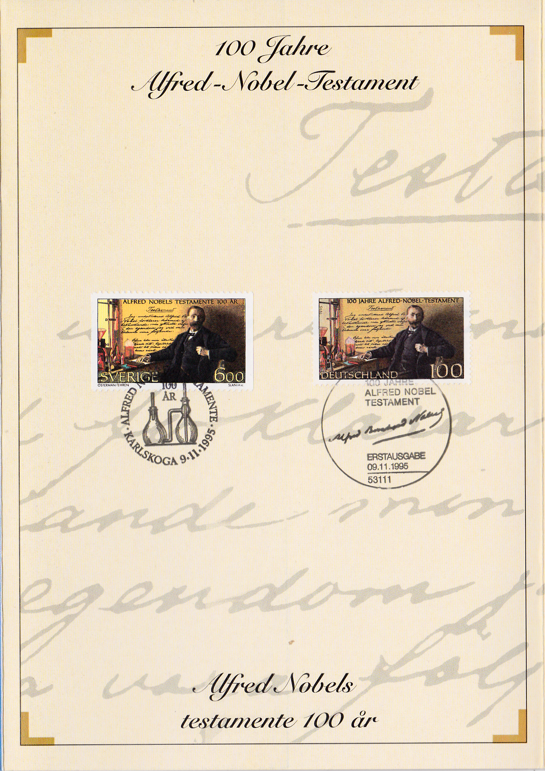 Auf der zweiten Innenseite die schwedische Marke mit dem Motiv der Nobelpreisverleihung an Conrad Röntgen und die deutsche Marke "100 Jahre Entdeckung der Röntgenstrahlen" mit einem Sonderstempel zu diesem Erinnerungsblatt aus Bonn.