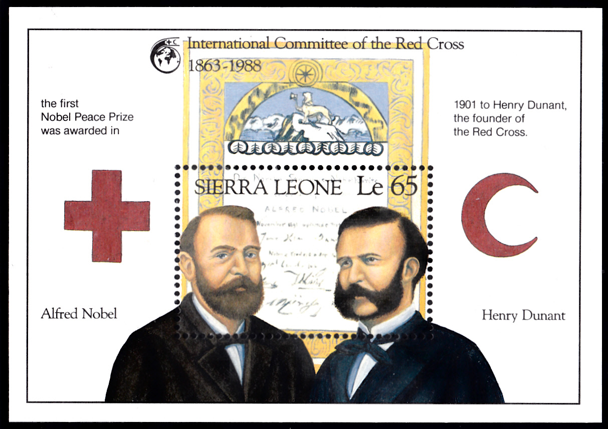 In Sierra Leone wurden in der Ausgabe "125 Jahre Internationales Rotes Kreuz" Alfred Nobel und der erste Friedensnobelpreisträger Henri Dunant auf einer Marke im Block (MiNr Block 84 mit Marke MiNr 1131) gezeigt.