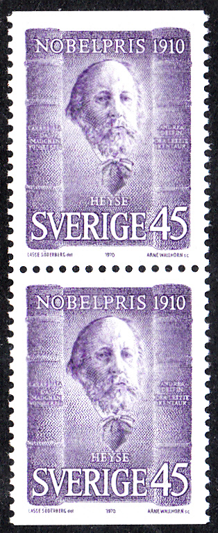 In Schweden ist 1970 zum 60. Jahrestag der Verleihung des Nobelpreises eine Marke mit einem Porträt von Paul Heyse erscheinen. Hier der Wert aus der Rolle (MiNr 697 C).