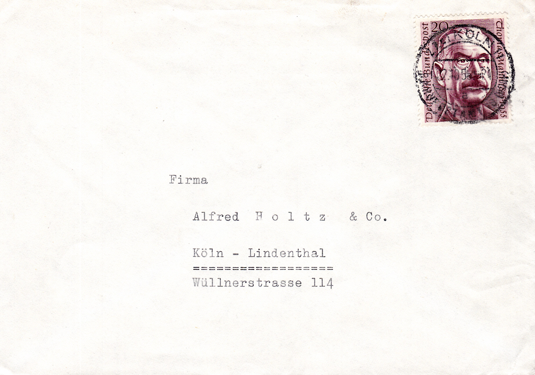 Einzelfrankatur der Marke der Deutschen Bundespost zum ersten Todestag von Thomas Mann (MiNr. 237) auf einem Ortsbrief aus Köln. Der Brief muss daher in der Gewichtsstufe von 21 bis 50 Gramm gewesen sein.