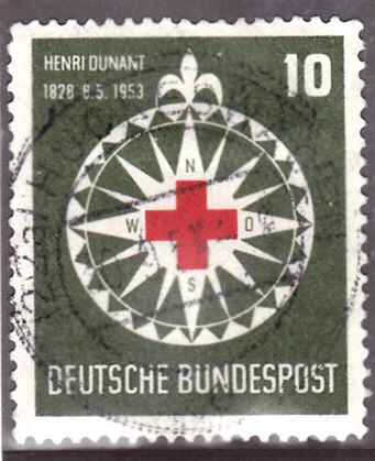Zum 125. Geburtstag von Henri Dunant erschien im Saarland am 3.5.1953 eine Marke (MiNr 343) mit seinem Porträt.