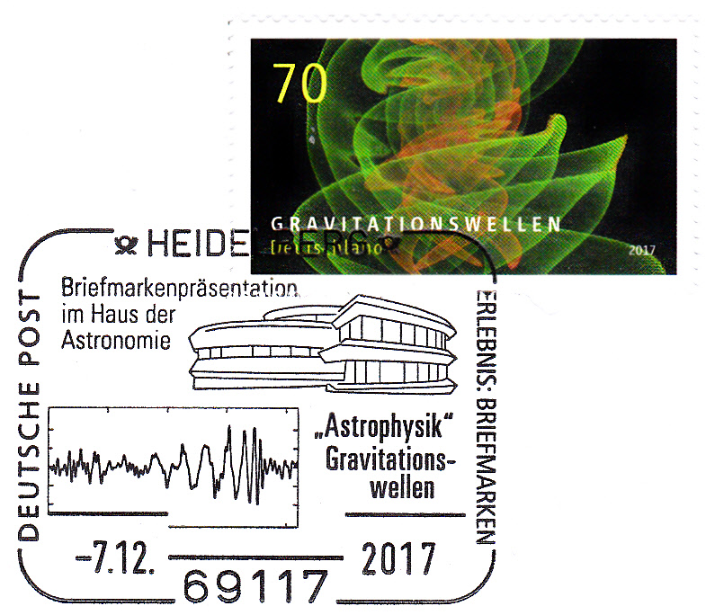 Bei der Deutschen Post erschien am 7.12.2017 eine Marke (MiNr 3348) die Gravitationswellen darstellt. Hier eine Marke vom Eckrand mit EAN-Code.
