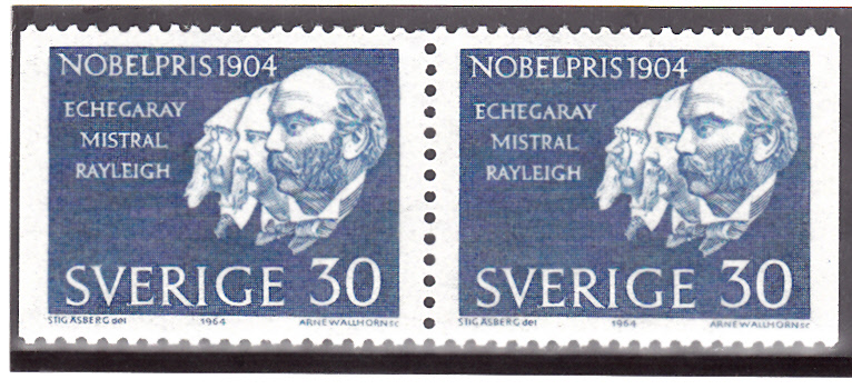 In Schweden ist 1964 eine Marke (MiNr 529) erschienen, die auch die Porträts von Frédéric Mistral und José Echegaray zeigt. Hier ein Paar aus dem Markenheftchen (529Dl/529Dr).