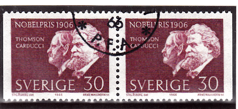 In Schweden ist 1966 eine Marke (MiNr 566) erschienen, die auch ein Porträt von Joseph John Thomson zeigt. Hier ein Paar aus dem Markenheftchen (566Dl/566Dr).