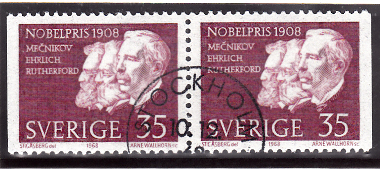 In Schweden ist 1968 eine Marke (MiNr 626) erschienen, die auch ein Porträt von Ernest Rutherford zeigt. Hier ein Paar aus dem Markenheftchen (626Dl/626Dr).