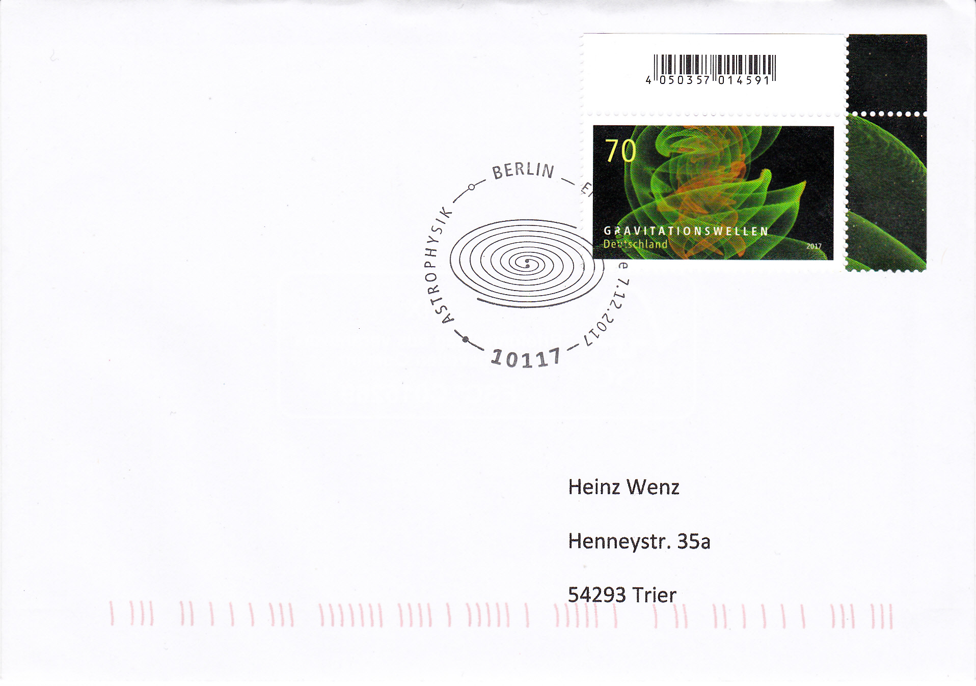 Bei der Deutschen Post erschien am 7.12.2017 eine Marke (MiNr 3348) die Gravitationswellen darstellt. Hier eine Marke vom Eckrand mit EAN-Code.