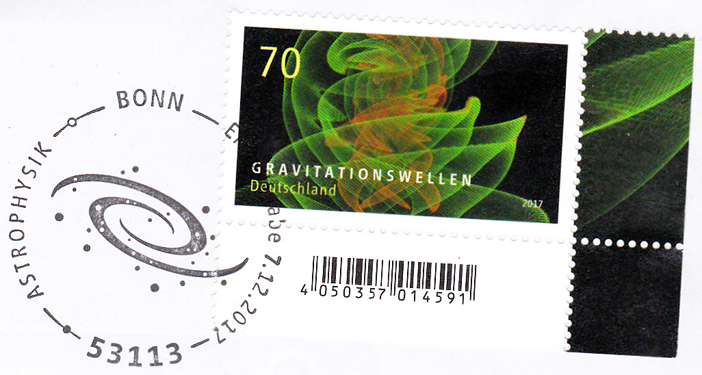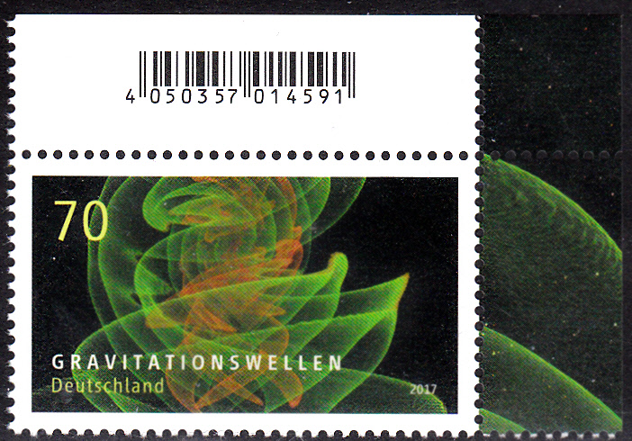 Bei der Deutschen Post erschien am 7.12.2017 eine Marke (MiNr 3348) die Gravitationswellen darstellt. Hier eine Marke vom Eckrand mit EAN-Code.
