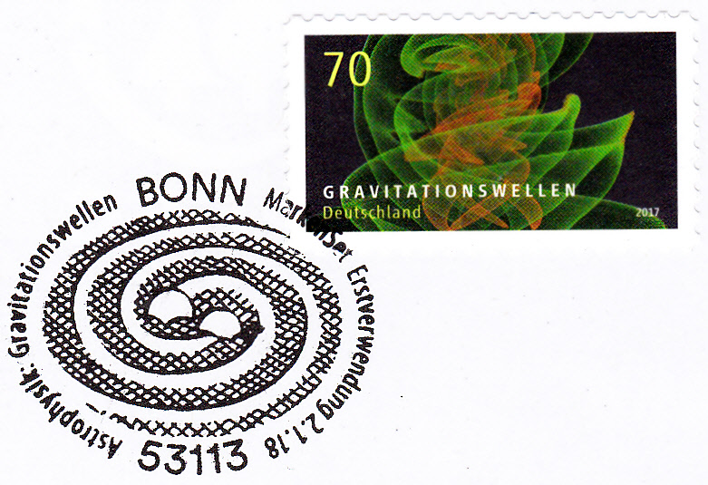 Am Ausgabetag der Marke wurde in Heidelberg dieser Sonderstempel eingesetzt. Im Stempelbild sind das Haus der Astronomie und eine Darstellung der Gravitationswelle abgebildet.