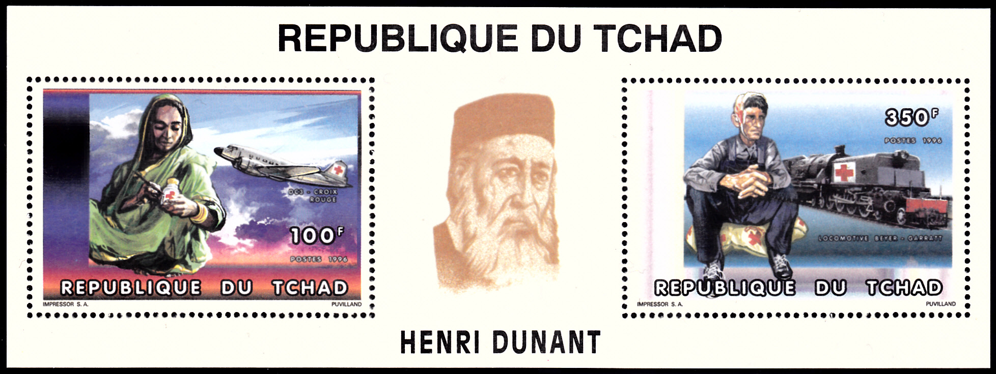Auf einem Block aus dem Tschad (MiNr Block 254 A mit den Marken MiNr 1353 b A und 1354 b A) zum Thema "Rotes Kreuz) wird ein Porträt auf dem Block zwischen den beiden Marken gezeigt.