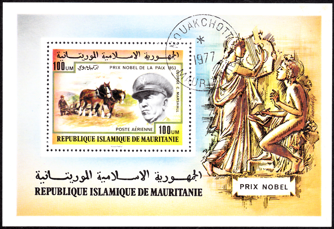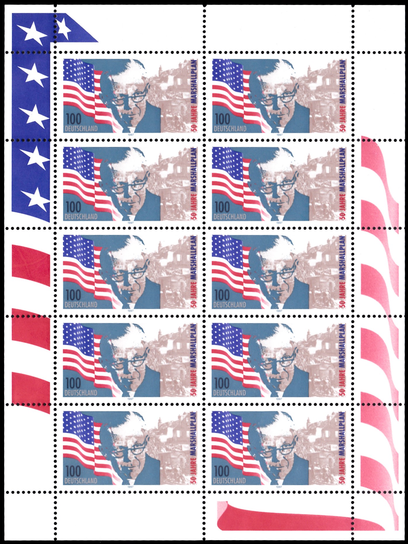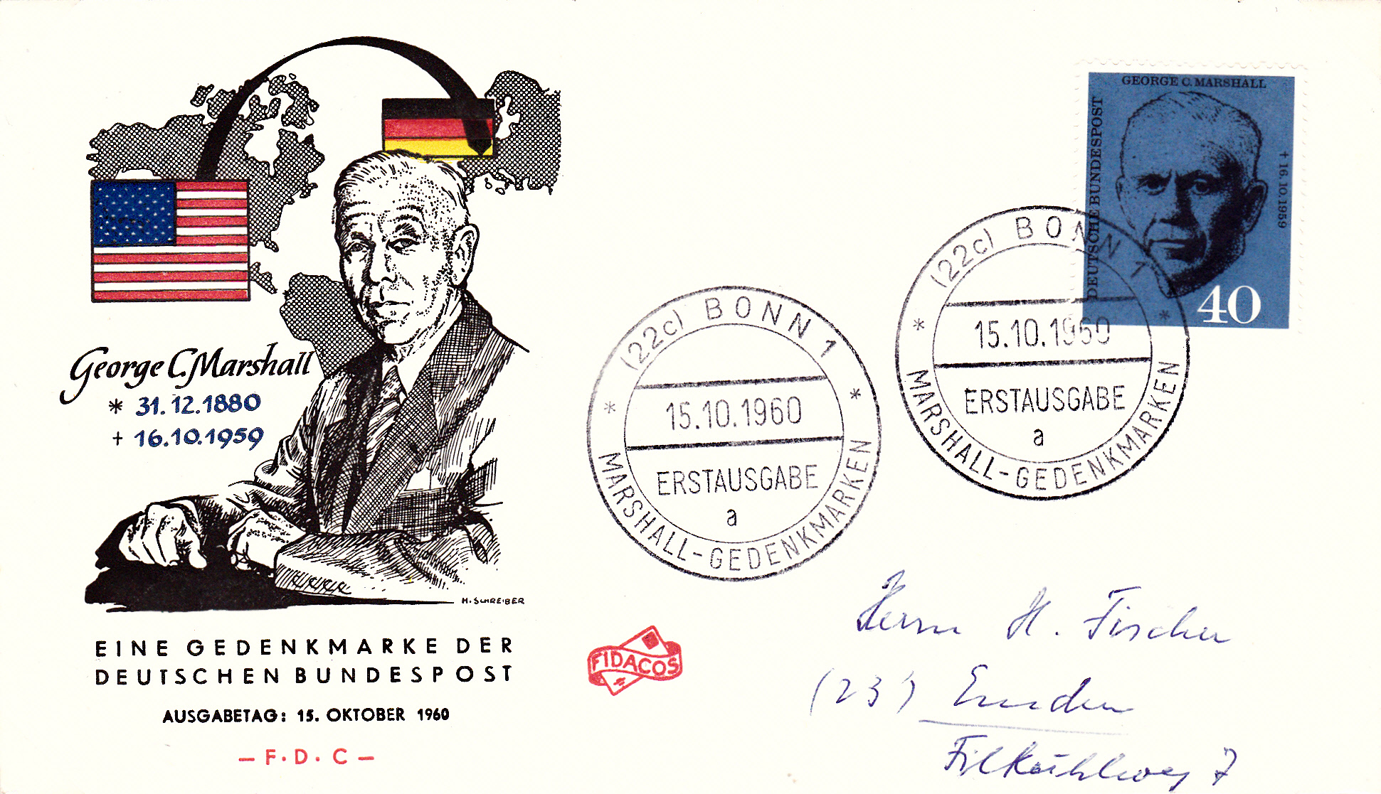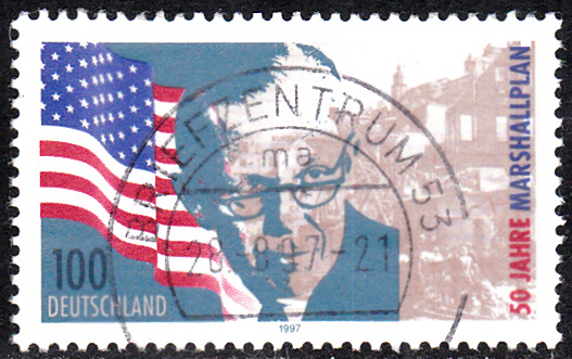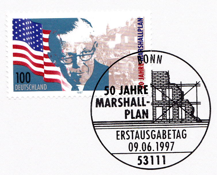 Zum 1. Todestag von George C. Marshall erschien bei der Deutschen Bundespost am 15.10.1960 diese Marke (MiNr 344) seinem Porträt.