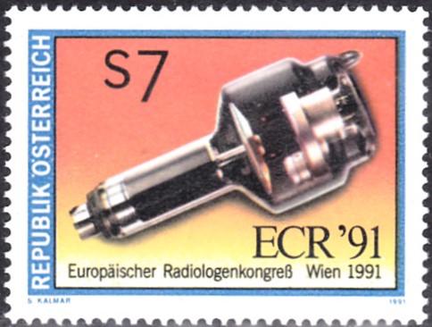 Auf dieser Marke aus Spanien (MiNr 1676) zum Kongress für Radiologie in Barcelona sind Wilhelm Conrad Röntgen, eine Doppelfokus-Drehanoden-Röntgenröhre und ein Atommodell zu sehen.