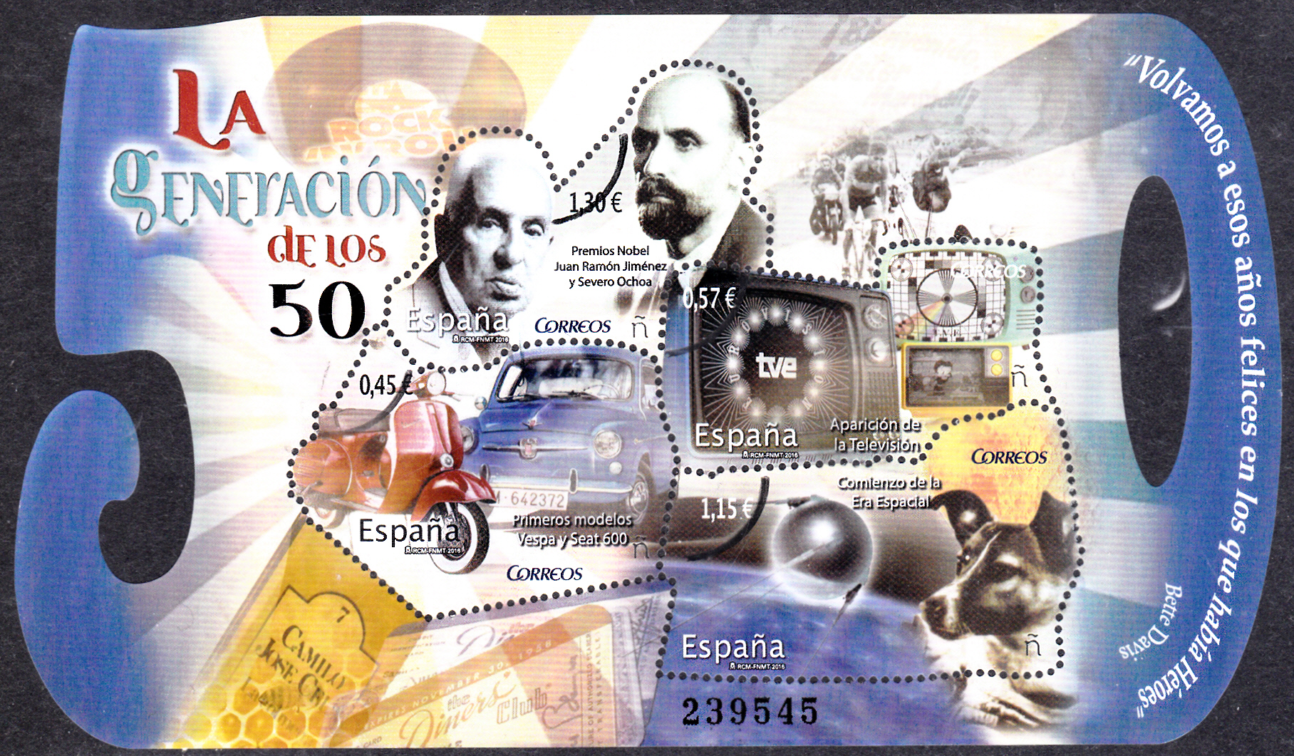 In einem Block " Generation der 1950er" aus Spanien (MiNr Block 287 mit den Marke MiNr 5109 bis 5112) zeigt die Marke zu 1,30€ ein Porträt von Severo Ochoa (links) und ein Porträt von Juan Ramón Jiménez (1881-1958; Dichter, Nobelpreis Literatur 1956).