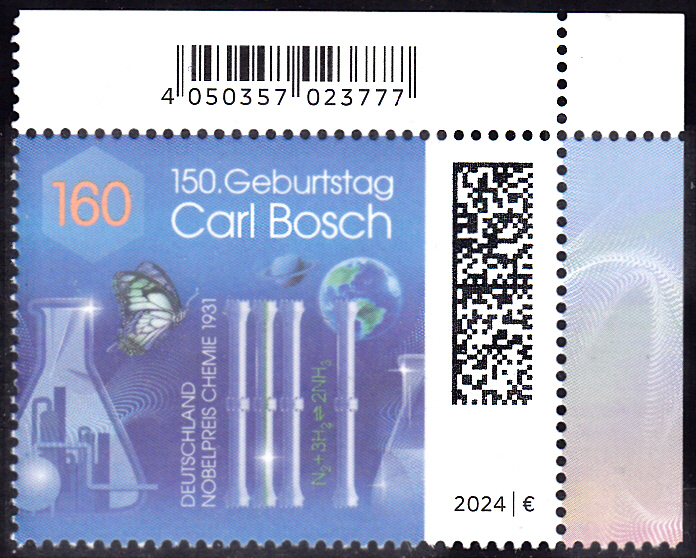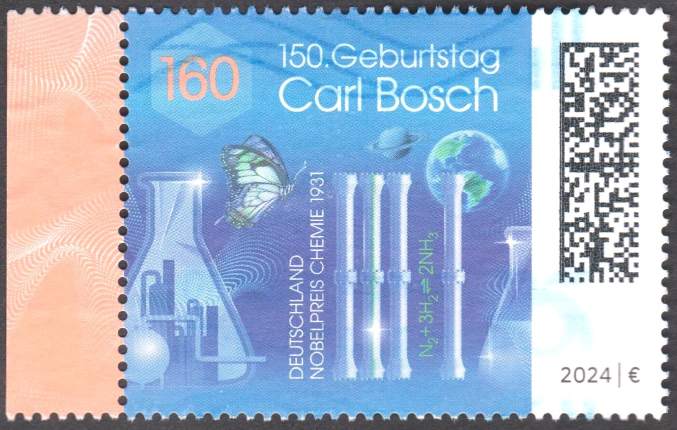 Zum 150. Geburtstag von Carl Bosch erschien bei der Deutschen Post dieses Postwertzeichen, MiNr. 3848, mit der Abbildung von einem Schwalbenschwanz (Papilio machaon), den Planeten Erde und Saturn, und mit Reagenzgläsern und Ammoniakreaktoren von Carl Bosch.