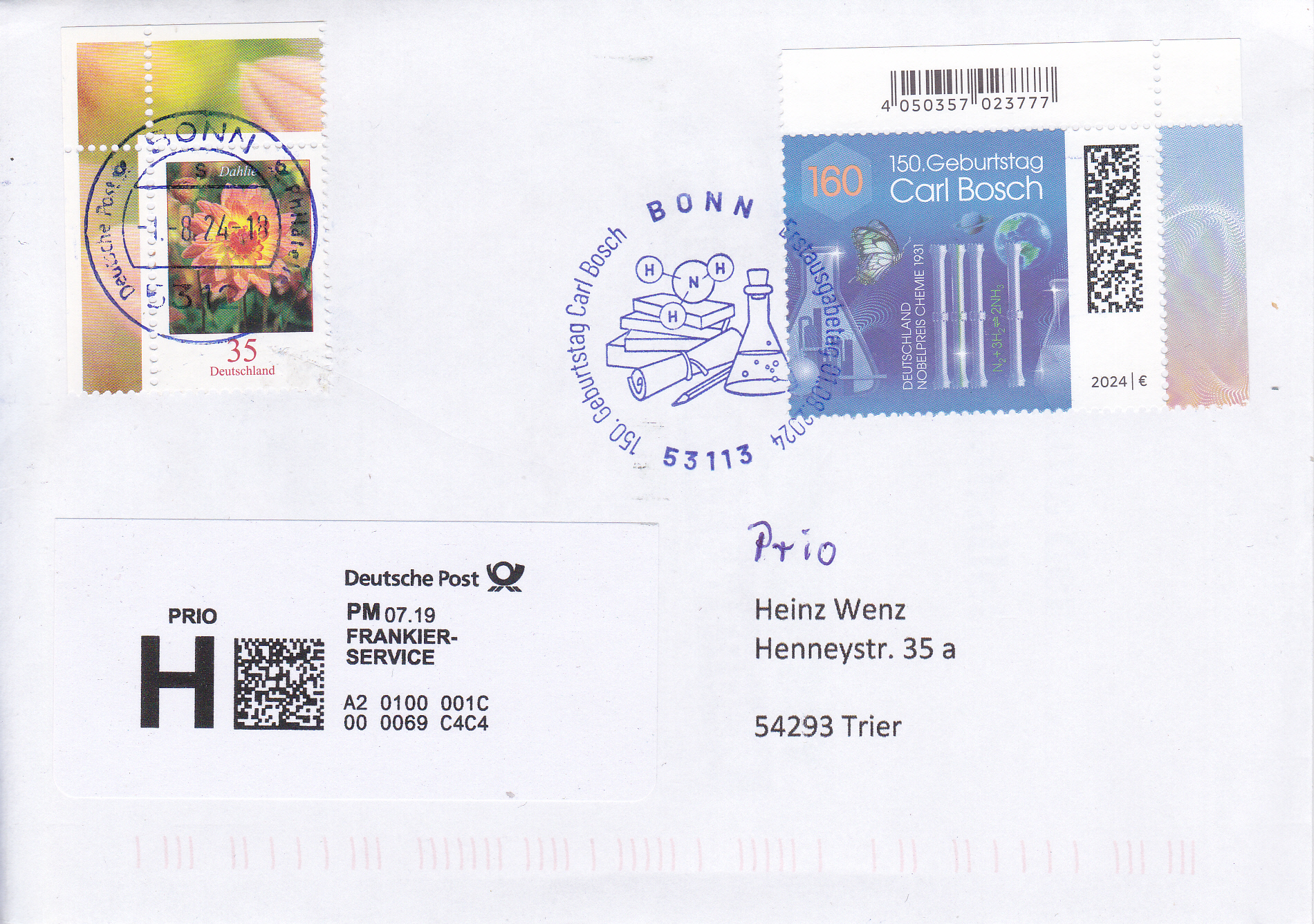 Prio-Brief mit dieser Marke und dem Ersttagsonderstempel Bonn. Die Zusatzfrankatur zu 35 Cent wurde mit einem Tagesstempel gestempelt.