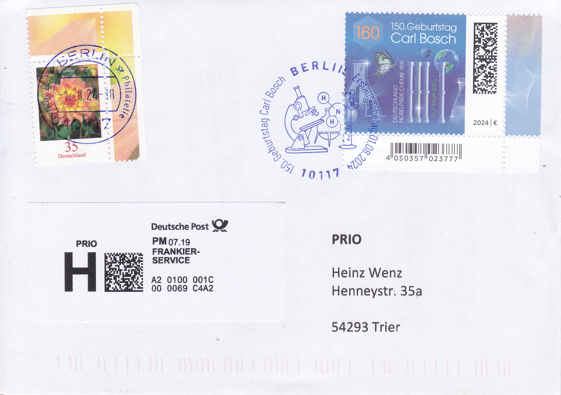 Prio-Brief mit dieser Marke und dem Ersttagsonderstempel Berlin. Die Zusatzfrankatur zu 35 Cent wurde mit einem Tagesstempel gestempelt.