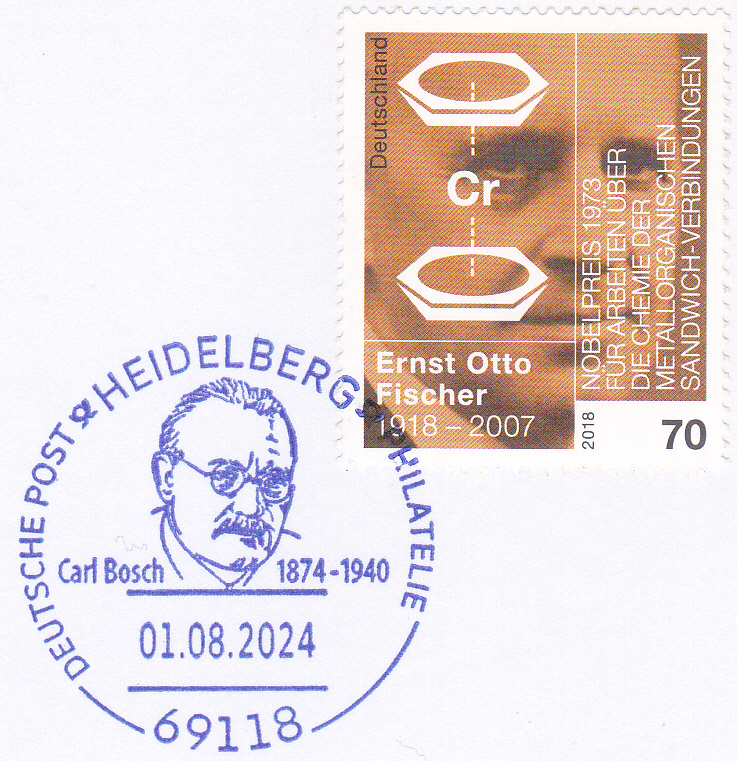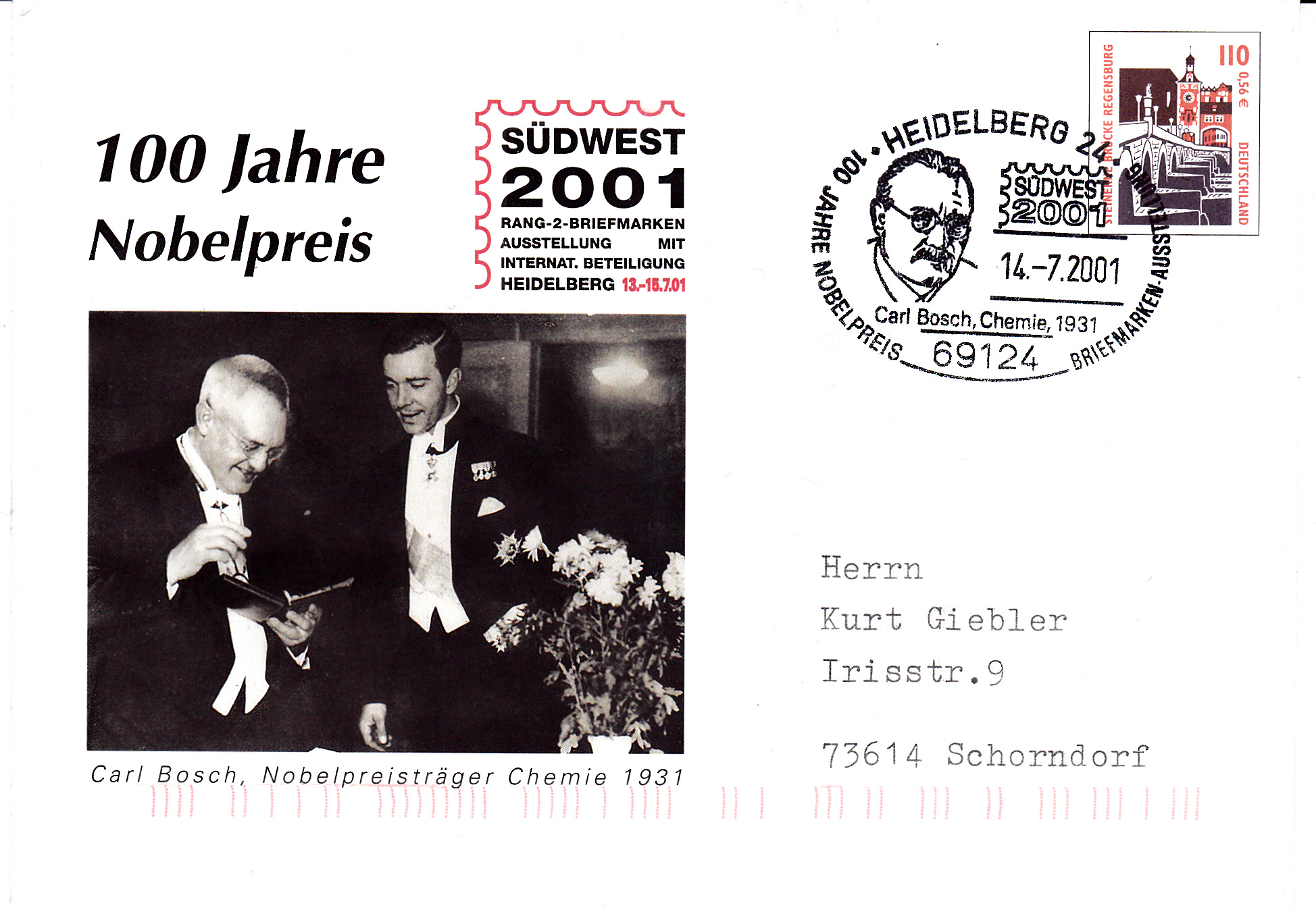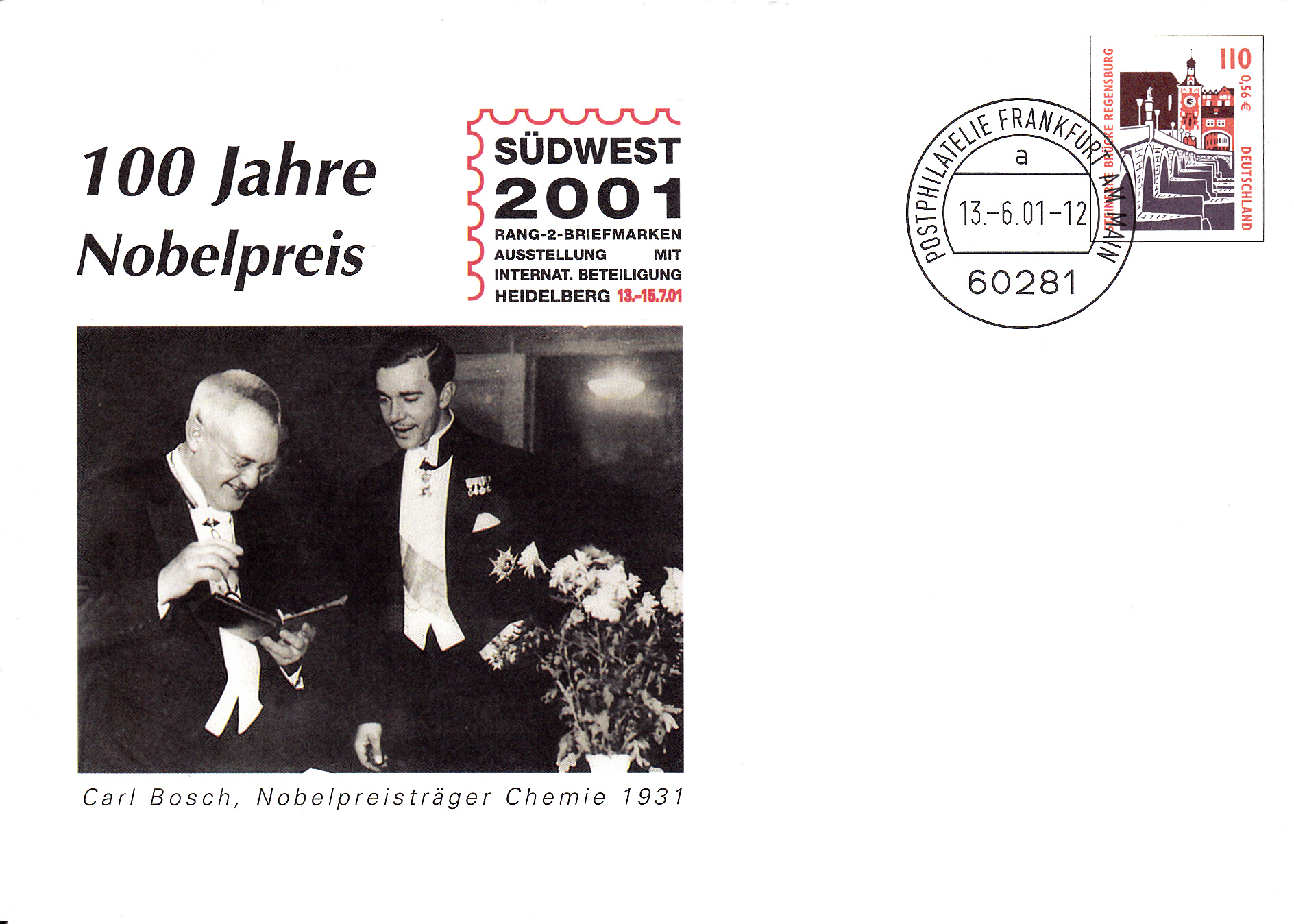 Auf diesem Sonderbriefumschlag zur Ausstellung "SÜDWEST 2001" (MiNr U 9) wird aus Anlass 100 Jahre Nobelpreis auch Carl Bosch als Nobelpreisträger Chemie 1931 geehrt. Der Umschlag ist leider nicht gelaufen.