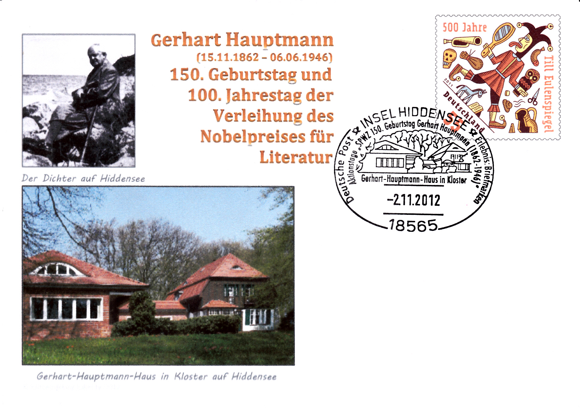 Auf zwei Marken der Freimarkenserie von 1948 der Sowjetischen Besatzungszone MiNr 213 (6Pf) und MiNr 223 (40Pf) ist ein Porträt von Gerhart Hauptmann zu sehen. Die beiden Werte gibt es auch noch mit anderem Wasserzeichen aus der DDR (MiNr. 328 und MiNr 336) aus dem dem Jahre 1952.