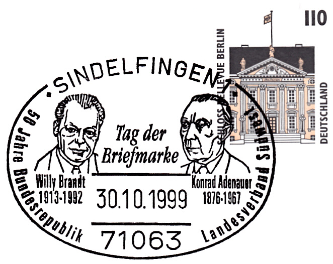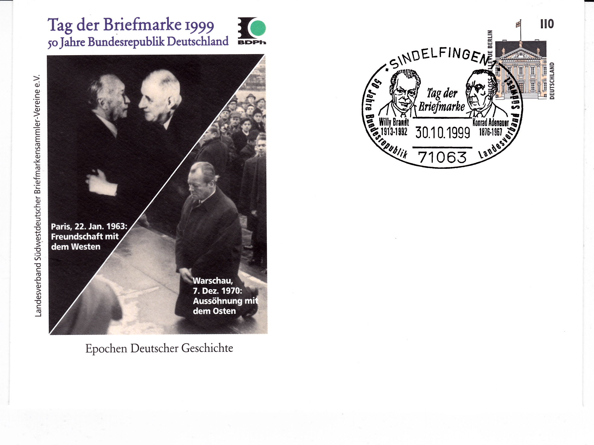 Ganzsache des Landesverbandes Südwestdeutscher Briefmarkensammler-Vereine e. V. mit dem dazu passenden Sonderstempel vom 30.10.1999 aus Sindelfingen zum Tag der Briefmarke 1999. Im Sonderstempel wird ein Porträt von Willy Brandt gezeigt, auf dem Umschlag wird ein Foto vom 7.12.1970 mit Willy Brandt in Warschau gezeigt.