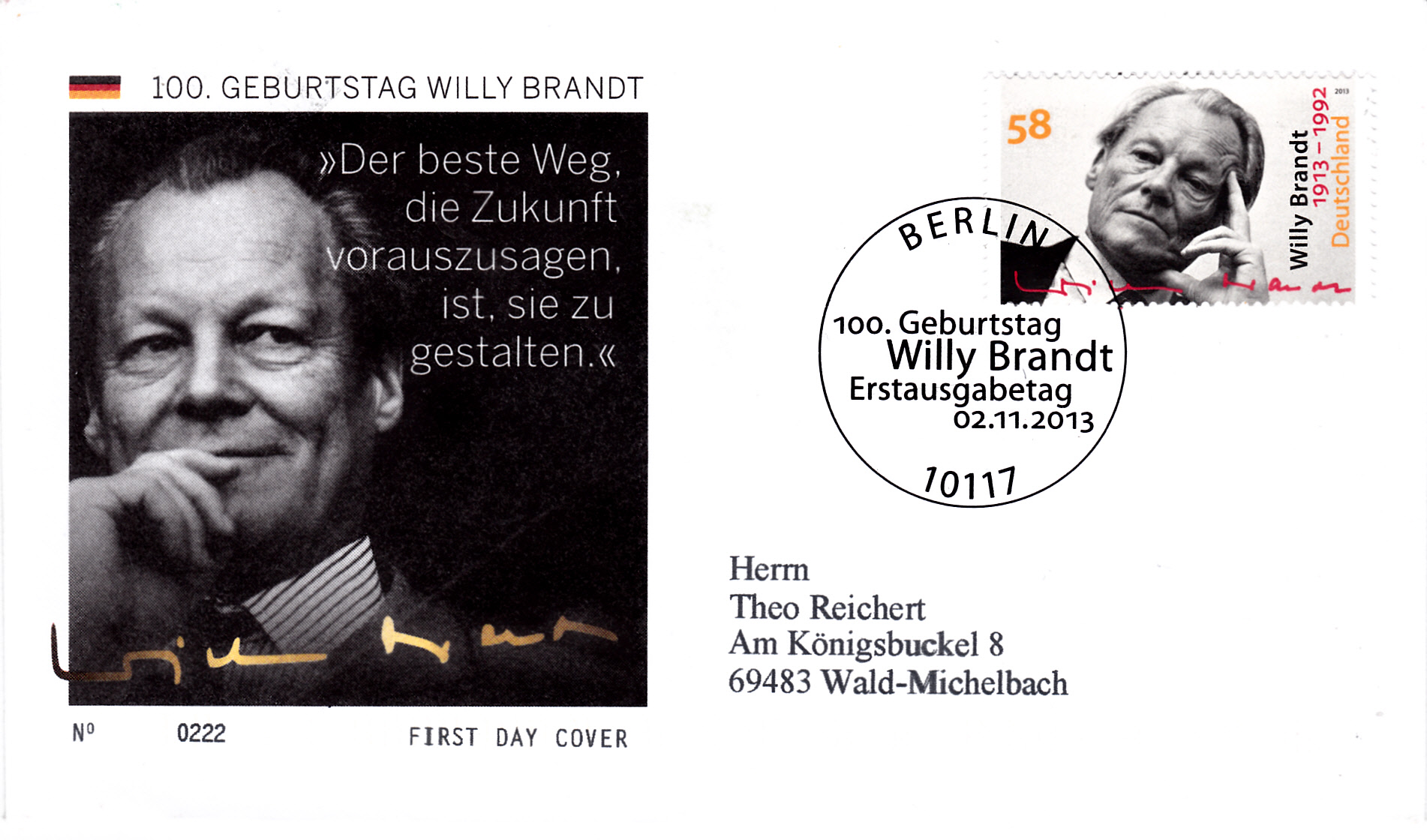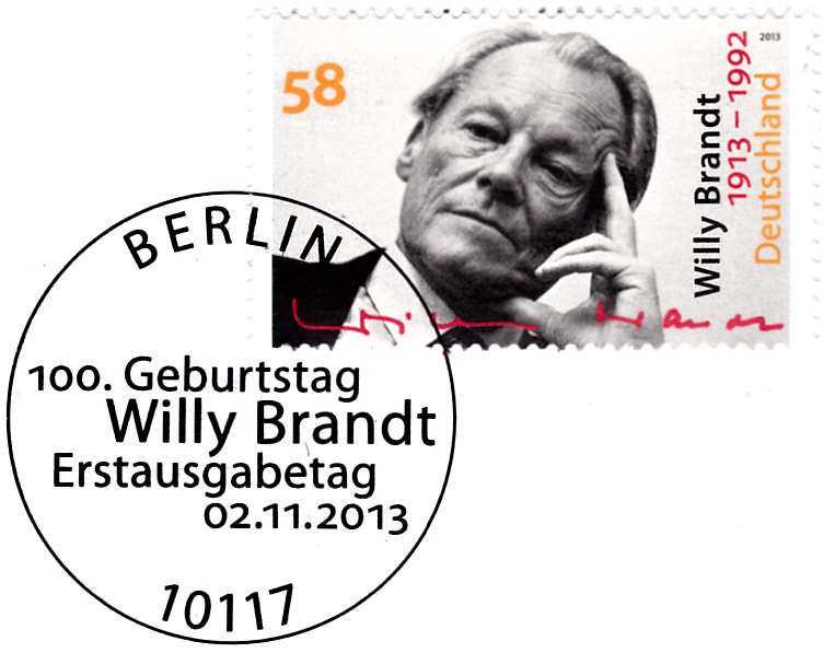 Gelaufener Ersttagsbrief mit der Marke zum 100. Geburtstag von Willy Brandt (MiNr 3037) mit dem Ersttagstempel Berlin.