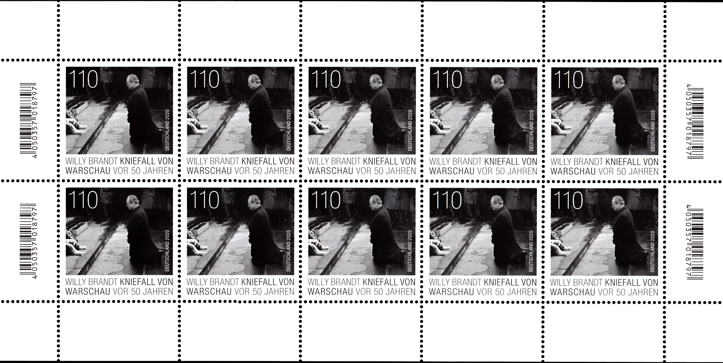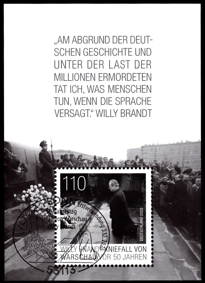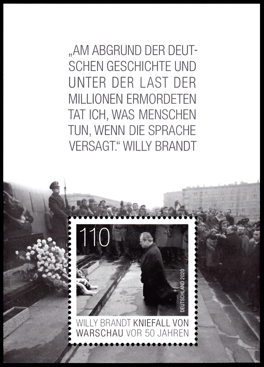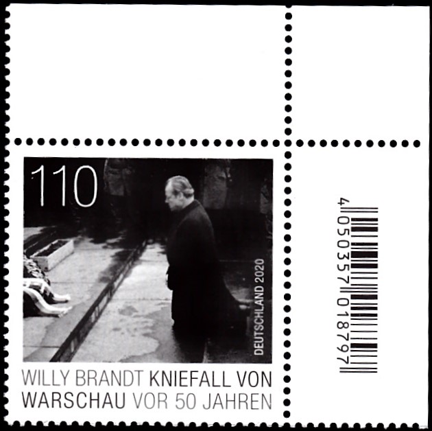 Zum 50. Jahrestag des Kniefalls von Warschau durch Willy Brandt am Denkmal für den Warschauer Ghetto-Aufstand erschien vei der Deutschen Post diese Marke (MiNr 3579).