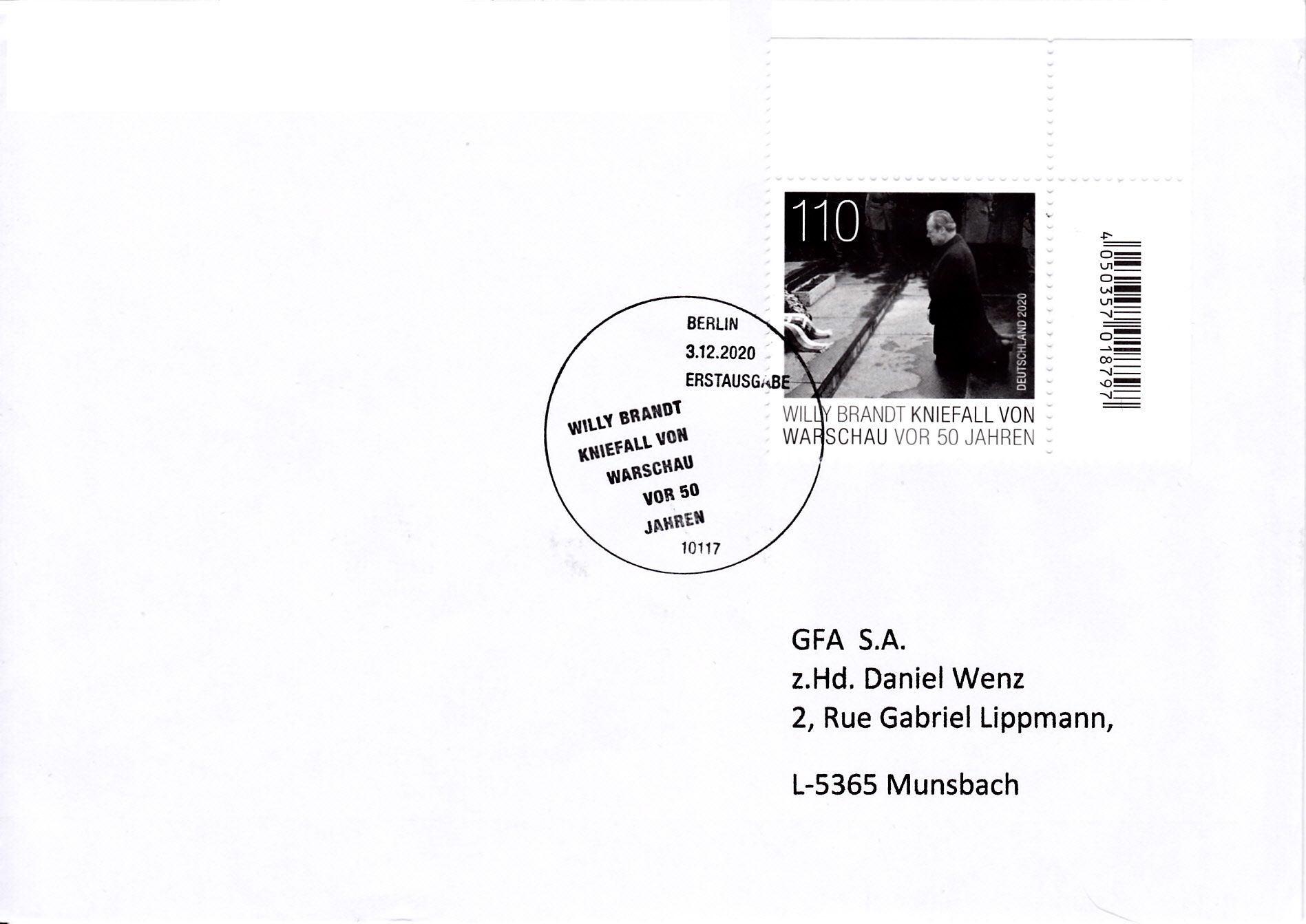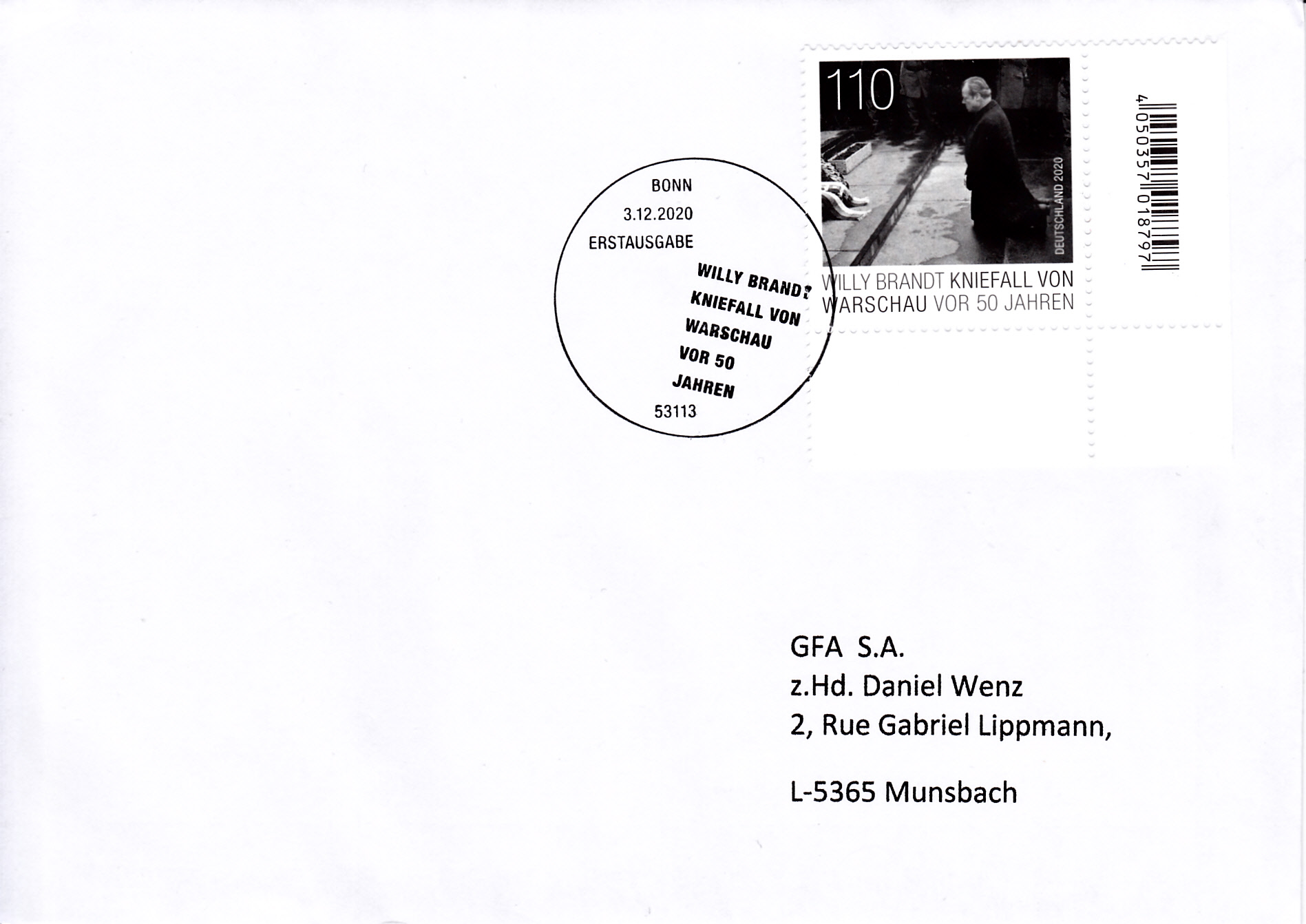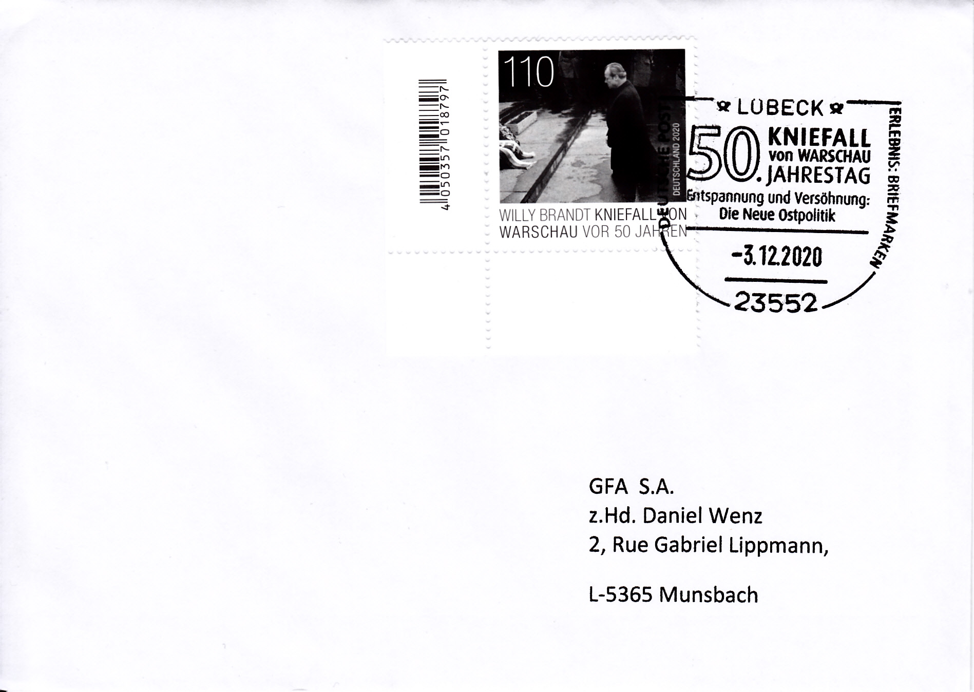 Zum 50. Jahrestag des Kniefalls von Warschau durch Willy Brandt am Denkmal für den Warschauer Ghetto-Aufstand erschien vei der Deutschen Post diese Marke (MiNr 3579).