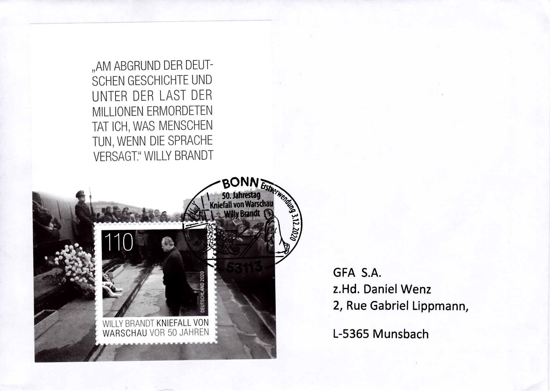 Brief vom Ersttag des Blocks "50. Jahrestag des Kniefalls von Warschau" mit dem Erstverwendungsstempel aus Bonn.