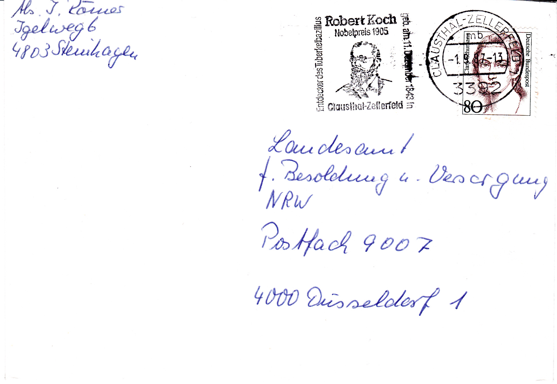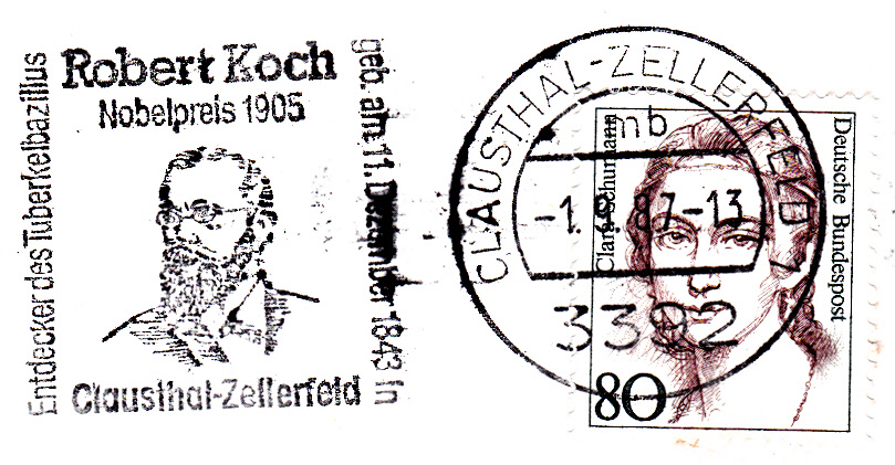 Maschinenwerbestempel aus Clausthal-Zellerfeld, dem Geburtsort von Robert Koch, mit einem Werbeeinsatz, der auf den berühmten Sohn der Stadt aufmerksam macht.