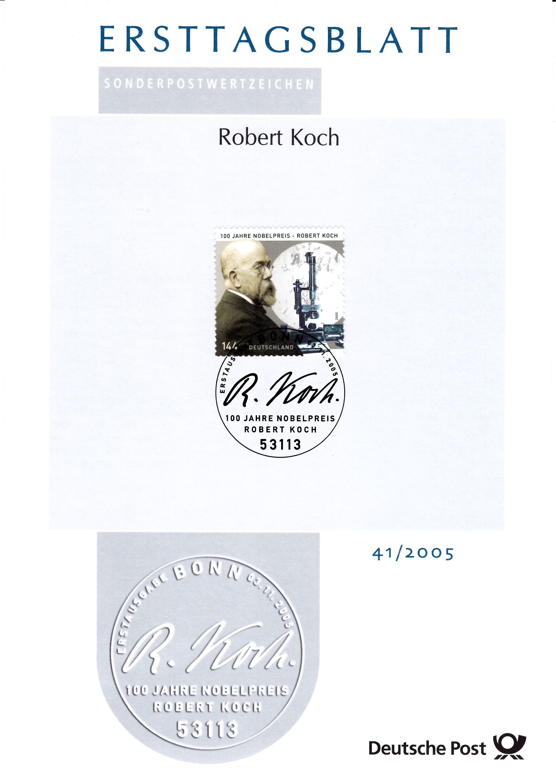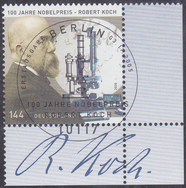 Zum 100. Jahrestag der Verleihung des Nobelpreises an Robert Koch ist bei der Deutschen Post diese Sondermarke (MiNr 2496) mit einem Porträt von Robert Koch und einem Mikroskop.