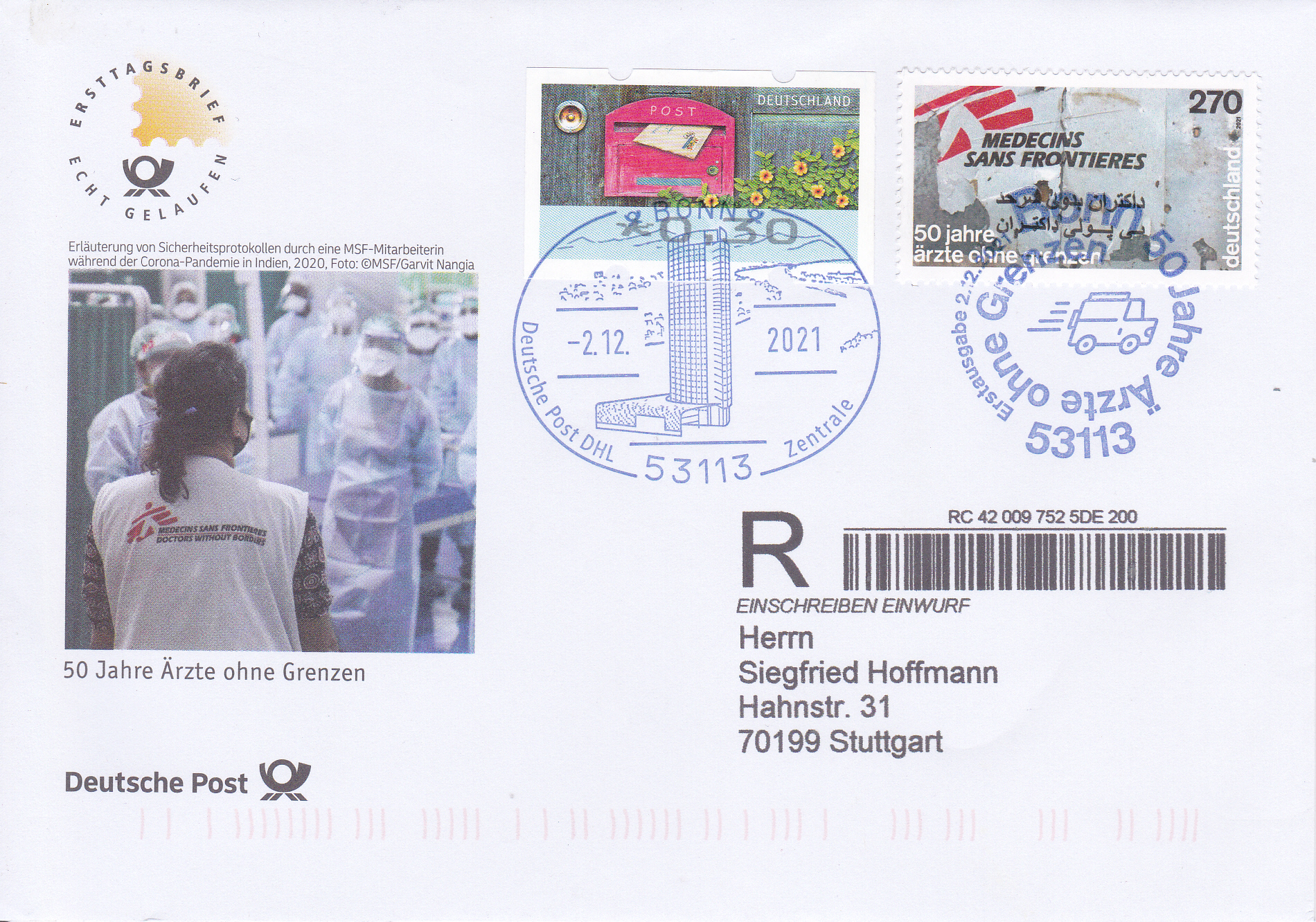 Ersttagsbrief der Deutschen Post mit der Marke "50 Jahre Ärzte ohne Grenzen" (MiNr 3650) und dem Ersttagstempel Bonn und der Zusatzfrankatur einer Automatenmarke zu 15 Cent mit einem Stempel der Deutschen Post DHL Zentrale in Bonn. Der "Einschreibezettel" wurde bei diesem Brief (ein Ersttagabrief aus dem Abo der Deutschen Post) beim Adressieren direkt aufgedruckt.