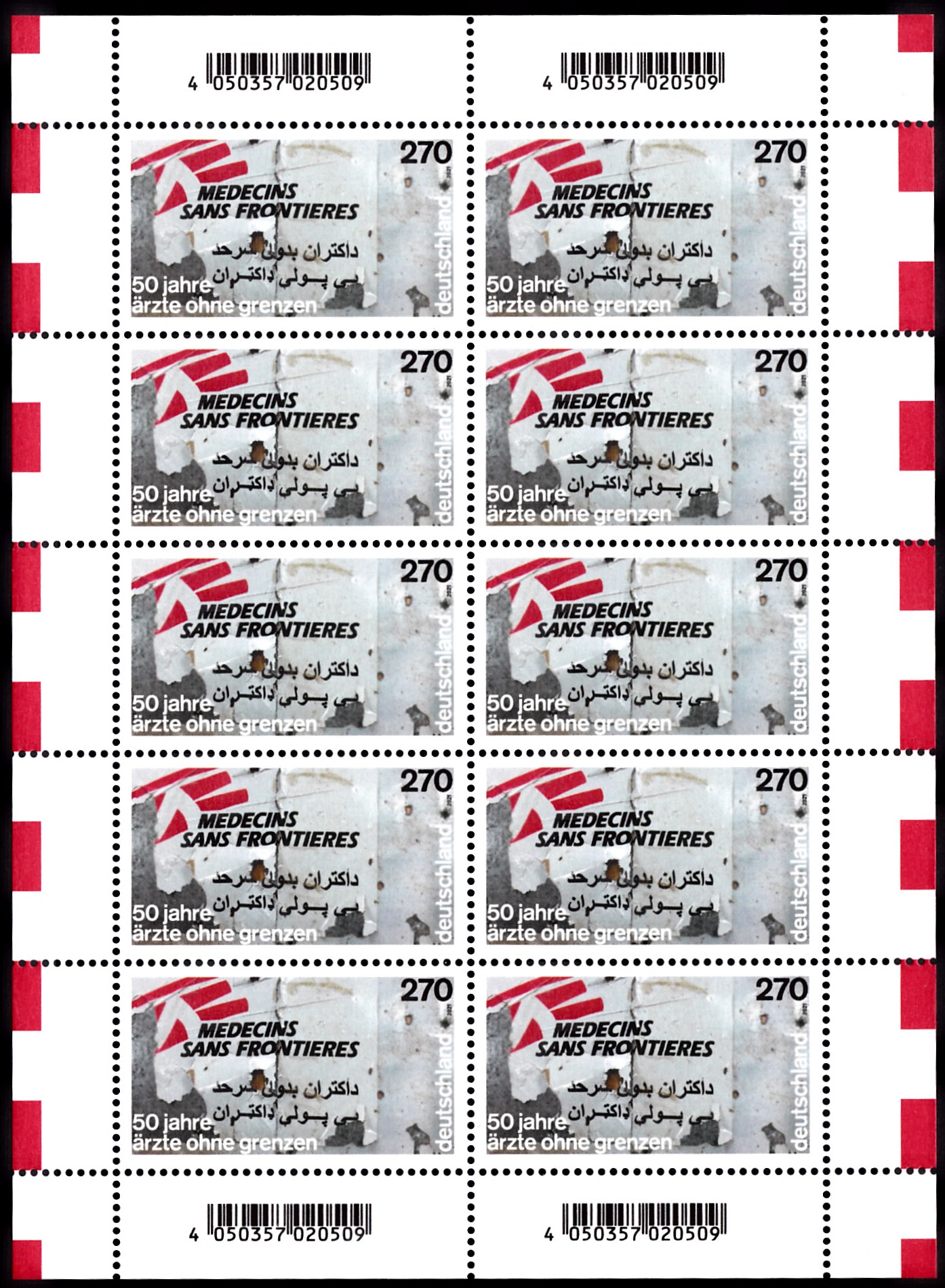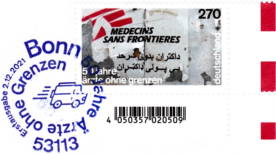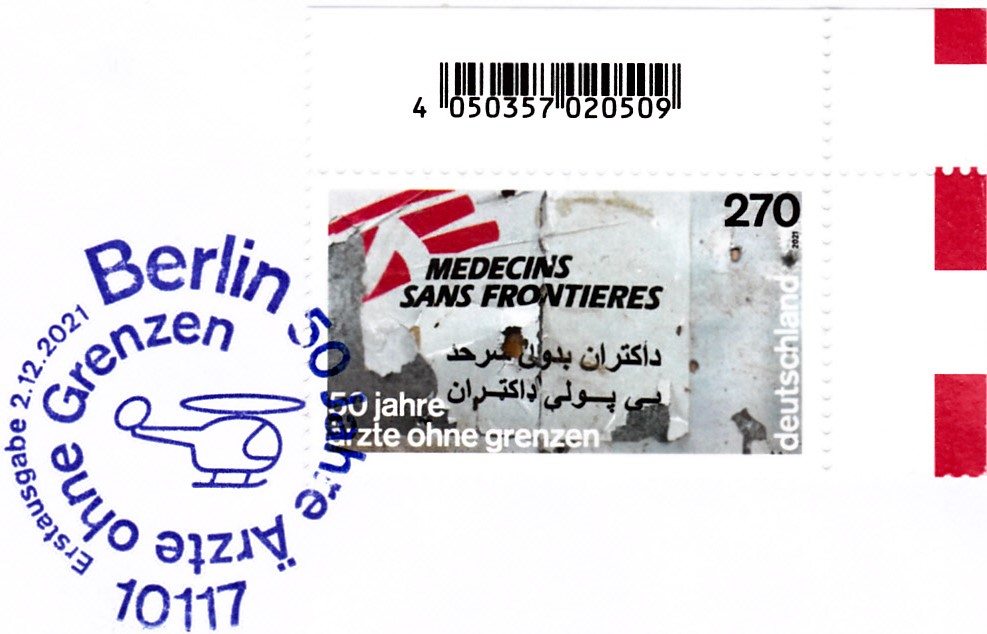 Bei der Deutschen Post ist diese Marke (MiNr 3650) zum Thema "50 Jahre Ärzte ohne Grenzen" erschienen. Die Marke zeigt ein beschädigtes Krankenhaus-Schild in Kundus (Afghanistan) nach einem Luftangriff im Jahre 2015.