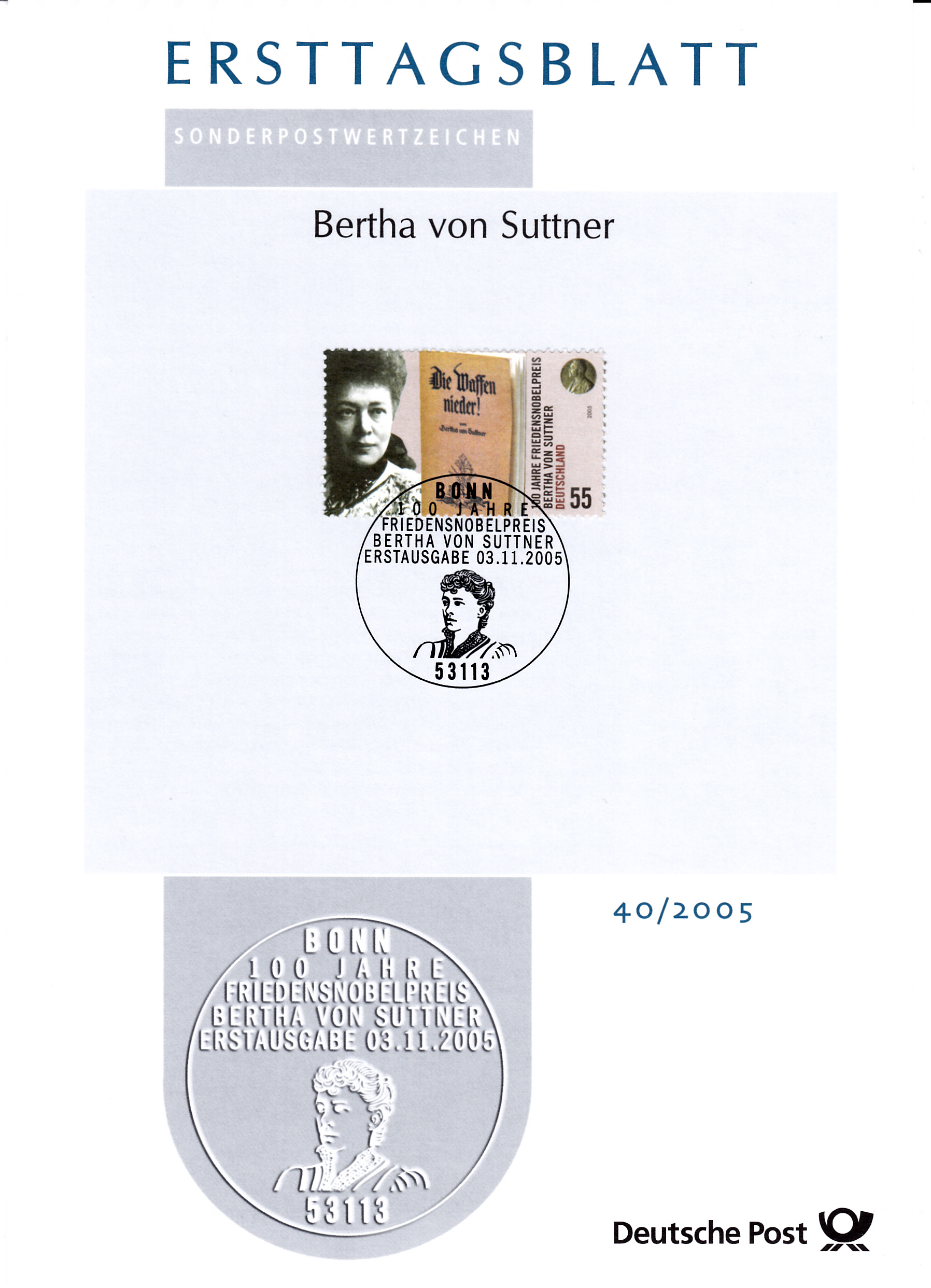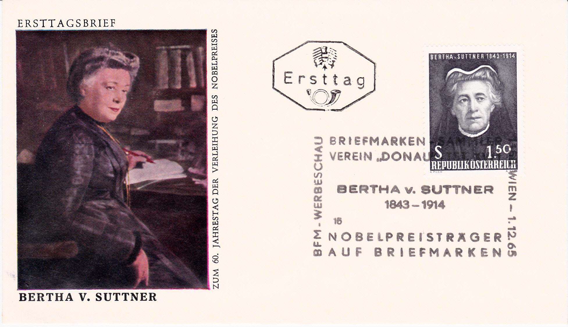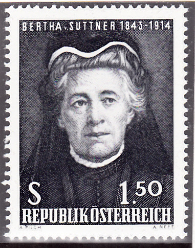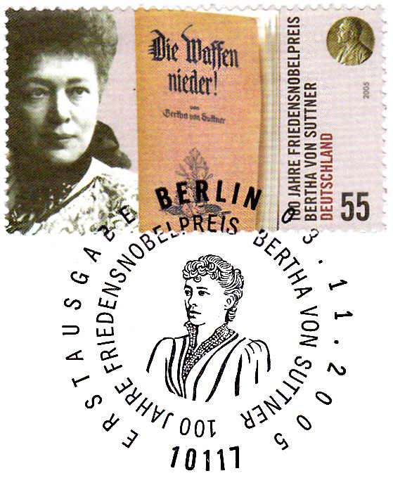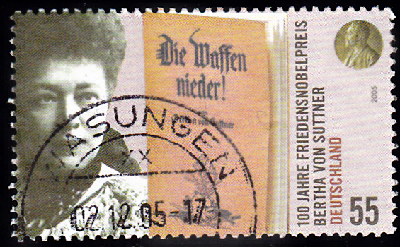 Bertha Freifrau von Suttner (geb. 9. Juni 1843 in Prag, geborene Gräfin Kinsky von Wchinitz und Tettau; gest. 21. Juni 1914 in Wien Innere Stadt) war eine österreichische Pazifistin, Friedensforscherin und Schriftstellerin. Sie wurde 1905 als erste Frau mit dem Friedensnobelpreis ausgezeichnet. Ihr Lebenswerk, unter anderem der Roman "Die Waffen nieder!", regte Nobel vermutlich zur Stiftung des Friedensnobelpreises an.