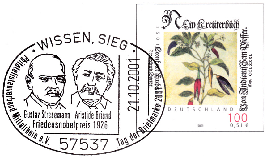 Pluskarte (MiNr PSo 77 II) mit einem Zudruck zum Tag der Briefmarke 2001 des Philatelistenverbandes Mittelrhein e.V. und dem dazu passenden Sonderstempel vom 21.10.2001 aus Wissen. Im Zudruck und im Sonderstempel werden die Nobelpreisträger Gustav Stresemann und Aristide Briand gezeigt.