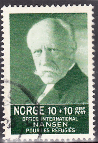 Bereits 1935 erschien in Norwegen eine Zuschlagsmarkenserie mit vier Marken für den 1. Internationaler Nansen-Fonds für Flüchtlinge in Genf mit der Nennung der Organisation auf der Marke und einem Porträt des Namensgebers. Hier zeige ich eine Marke aus der Serie zu 10+10 Öre (MiNr 172).