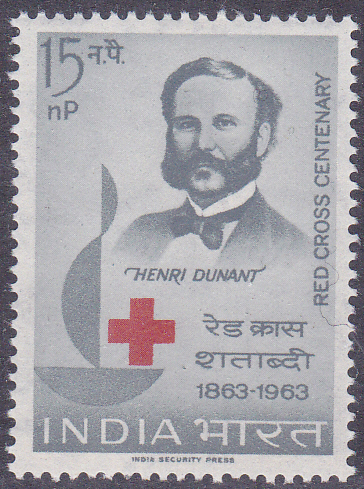 Hier die Marke aus Indien (MiNr 353) zum Jubiläum "100 Jahre Rotes Kreuz". Im Markenbild werden der Gründer des IRK Henri Dunant (1828-1910) und das Jubiläumsemblem des Roten Kreuzes gezeigt.
