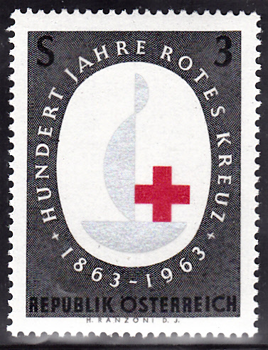 Marke aus Österreich zum Jubiläum "100 Jahre Rotes Kreuz" (MiNr 1135) mit dem Jubiläumssignet des Roten Kreuzes.