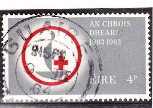 In Irland gab es zwei bildgleiche Marken zum Jubiläum "100 Jahre Rotes Kreuz" (MiNr 161/2) mit dem Jubiläumssignet des Roten Kreuzes. Hier der Wert zu 4 P.