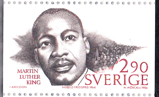 In Schweden erschienen 1986 in einem Markenheftchen fünf Marken mit Friedensnobelpreisträgern. Hier die Marke mit Martin Luther King (MiNr 1416).