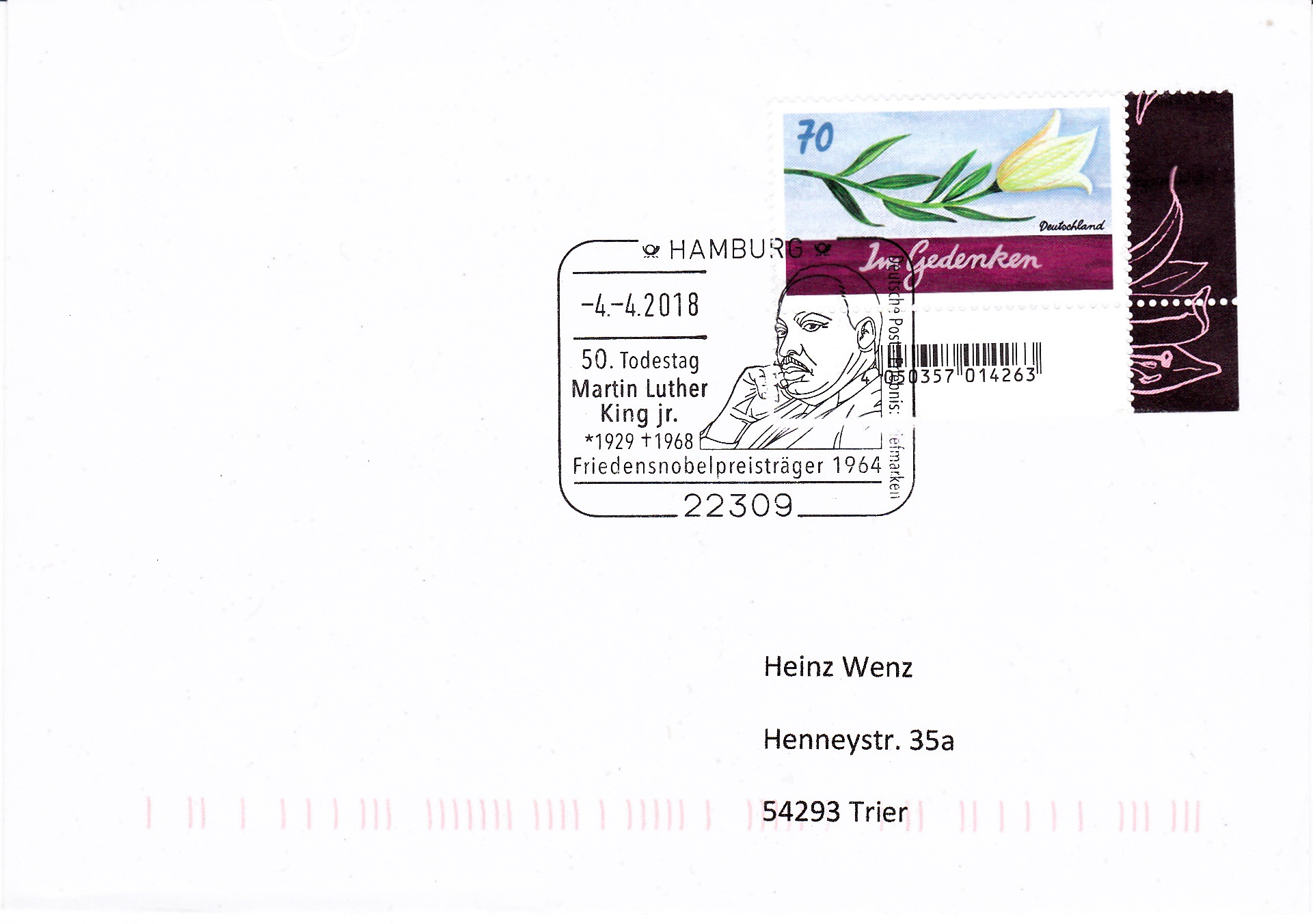 Dieser Sonderstempel vom 4.4.2018 aus Hamburg mit einem Porträt von Martin Luther King erinnert an den 50. Todestag des Friedensnobelpreisträgers.