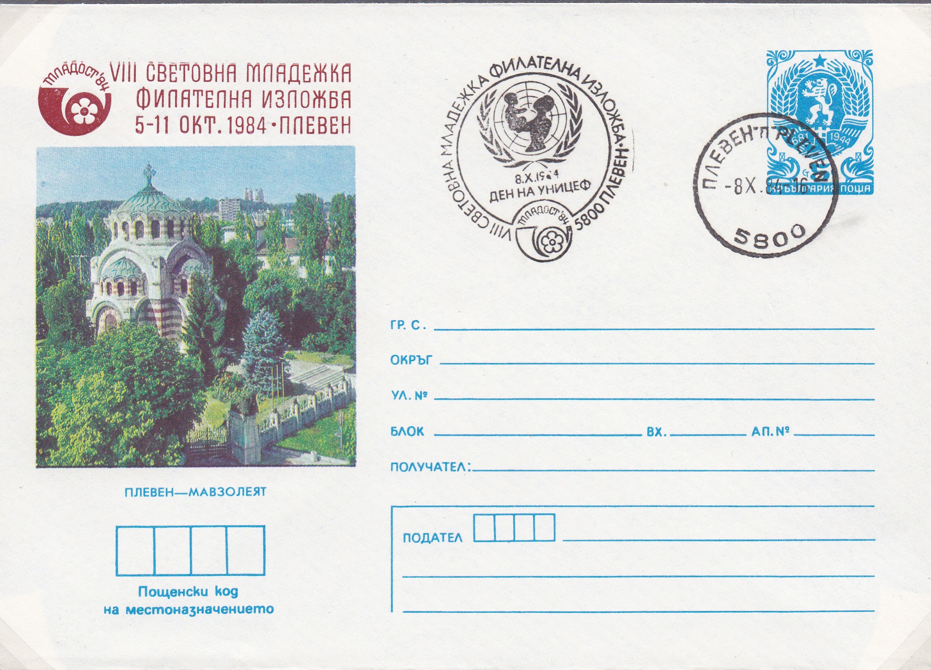 Sonderstempel aus Pleven vom 8.10.1984 zur 6. Weltausstellung junger Philatelisten "Mladost 84" mit dem Emblem des Kinderhilfswerkes der Vereinten Nationen im Stempelbild auf einer Sonderganzsache zur Ausstellung. Leider ist die Ganzsache nicht gelaufen.