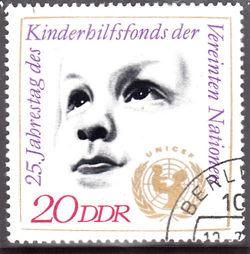 Sondermarke aus der DDR zu 25 Jahre Kinderhilfsfonds der Vereinten Nationen (UNICEF) (MiNr 1690). Als Motiv der dient ein Kindergesicht und das Emblem der UNICEF.