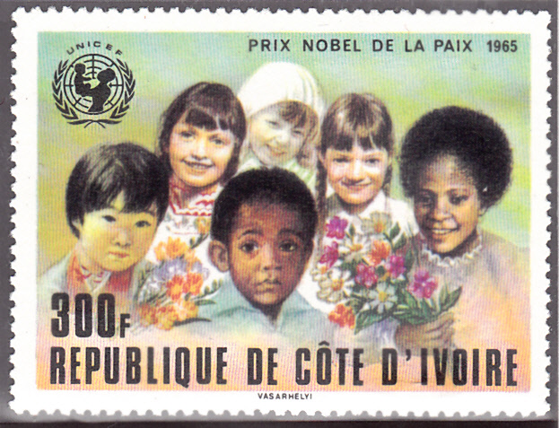 In einer Serie "Nobelpreisträger" aus der Elfenbeinküste erschien auch diese Marke (MiNr 550) für UNICEF als Friedensnobelpreisträger des Jahres 1965. Im Markenbild erkennen wir wieder Kinder aus verschiedenen Ländern.