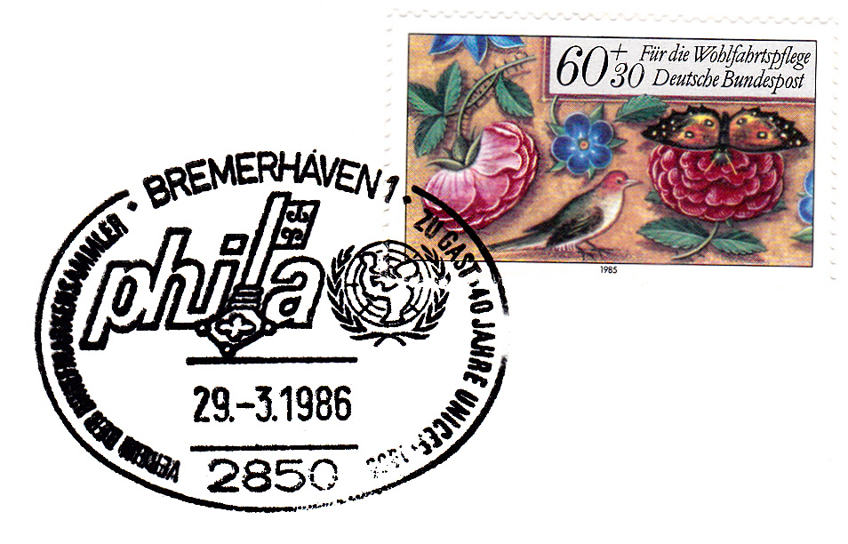 Sonderstempel vom 29.3.1986 aus Bremerhaven zu "40 Jahre UNICEF" mit dem UNICEF-Emblem im Stempelbild.