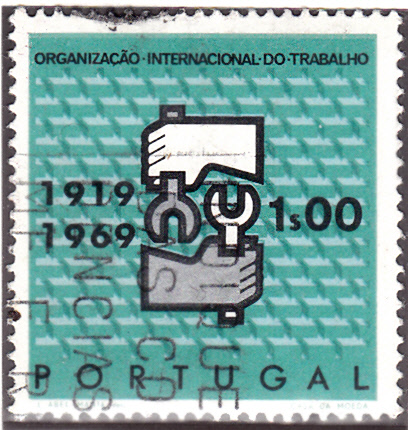 Auch in Portugal erschien eine Serie mit drei bildgleichen Marken zum Jubiläum "50 Jahre Internationale Arbeitsorganisation (ILO)" mit dem ILO-Emblem. Hier eine Marke aus dieser Serie zu 1,00 E (MiNr 1076).