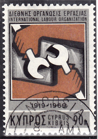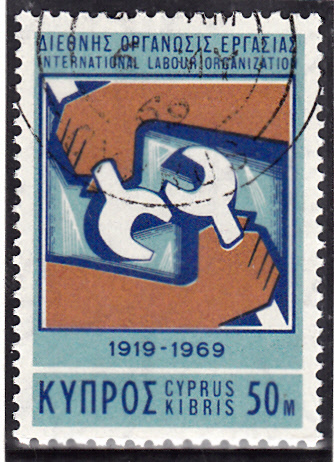 Auch in Zypern erschienen zum Jubiläum "50 Jahre Internationale Arbeitsorganisation" zwei Marken mit dem ILO-Emblem.