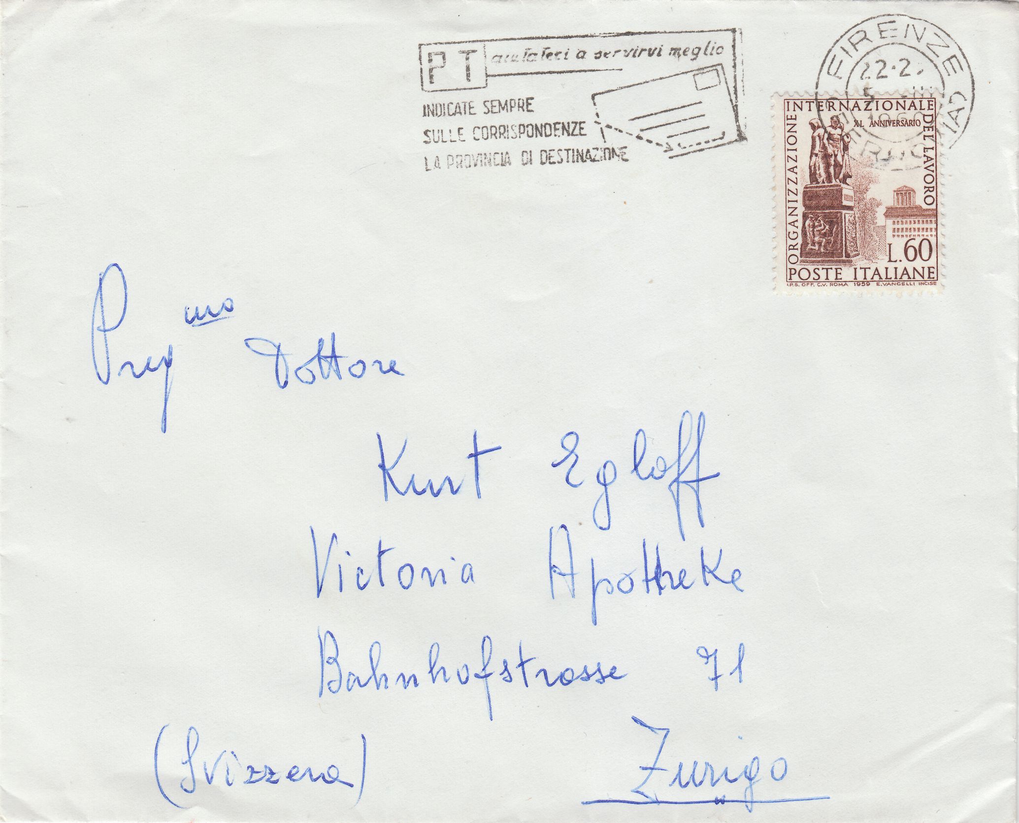 Zum 40-jährigen Jubiläum der Internationalen Arbeitsorganisation = italienisch "ORGANIZZAZIONE INTERNAZIONALE DEL LAVORO" erschien 1959 in Italien diese Sondermarke, hier am 0503.1960 als EF auf Brief in die Schweiz gebraucht: