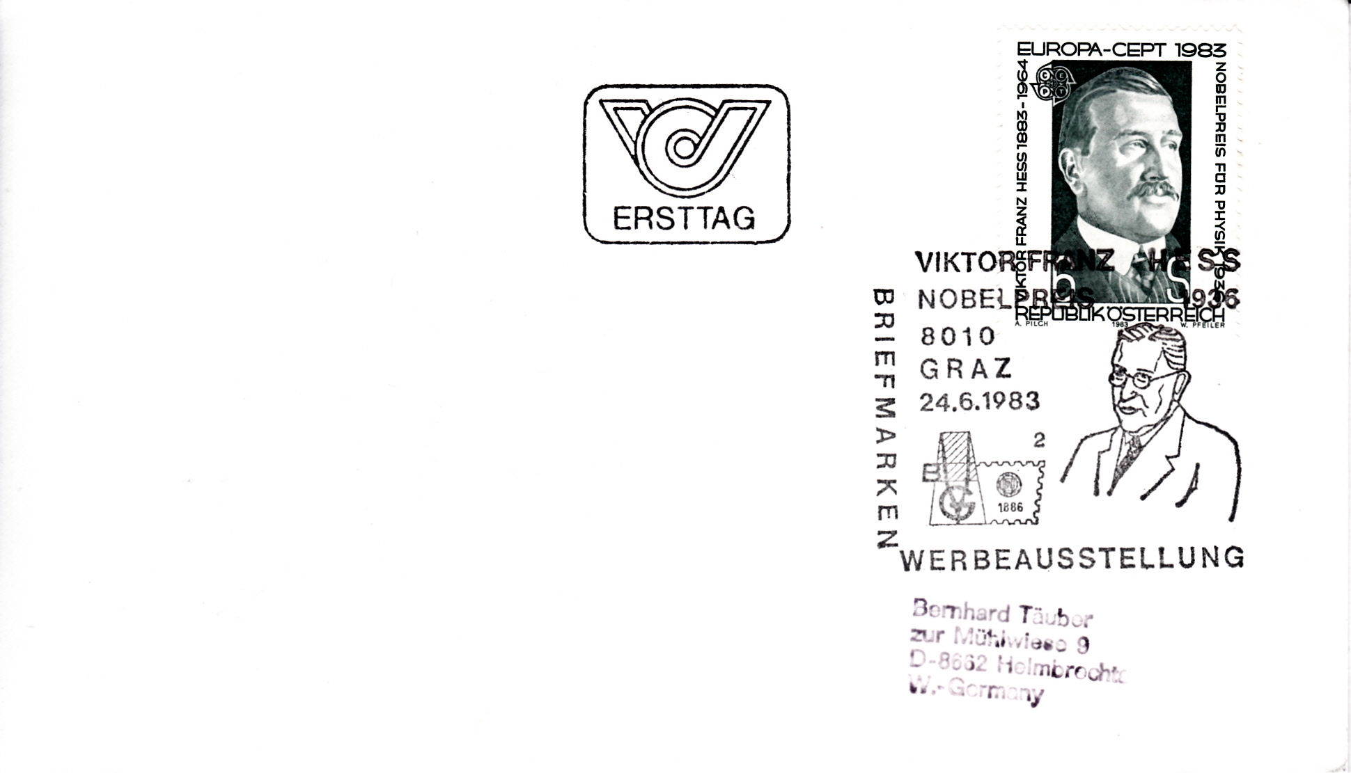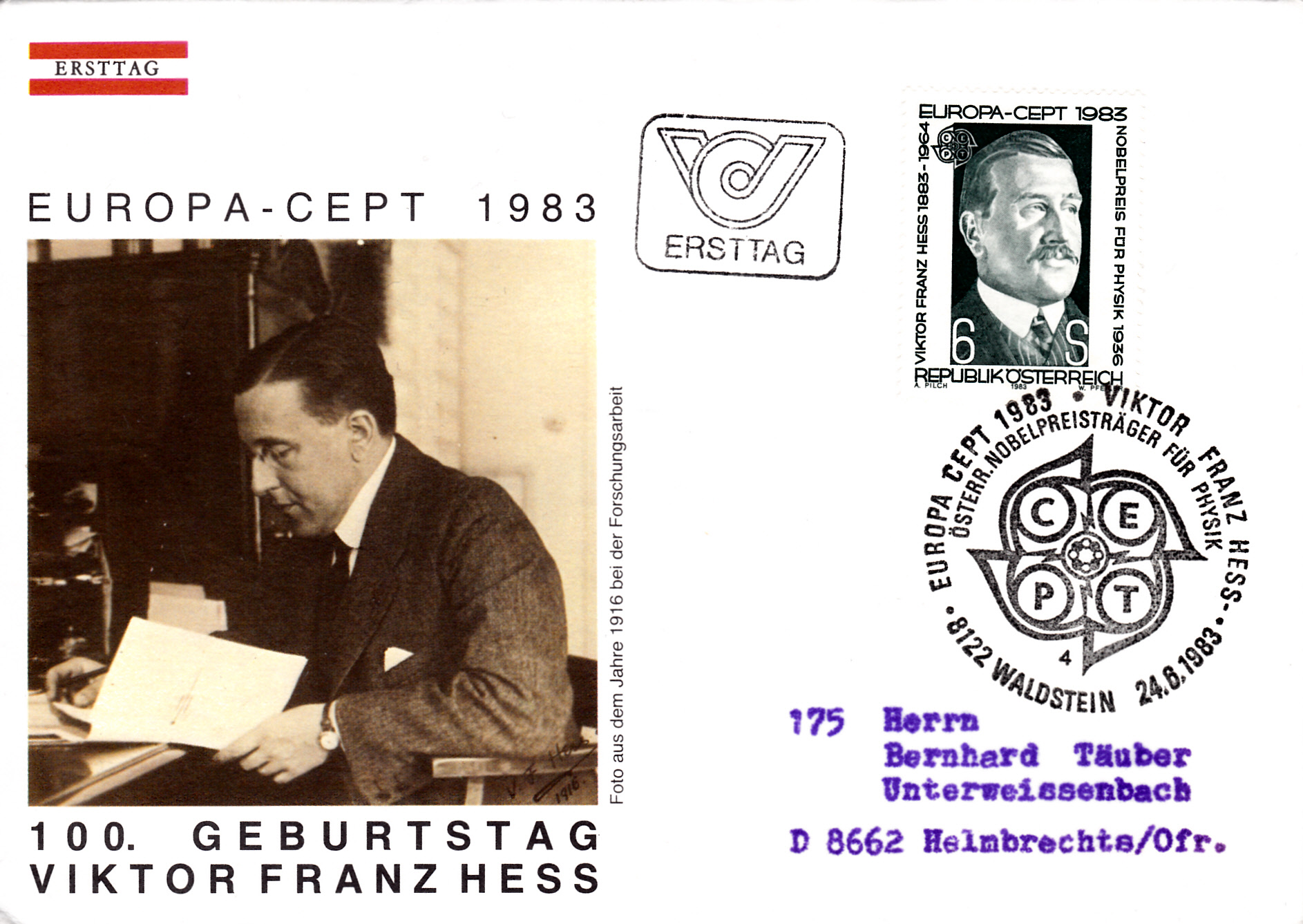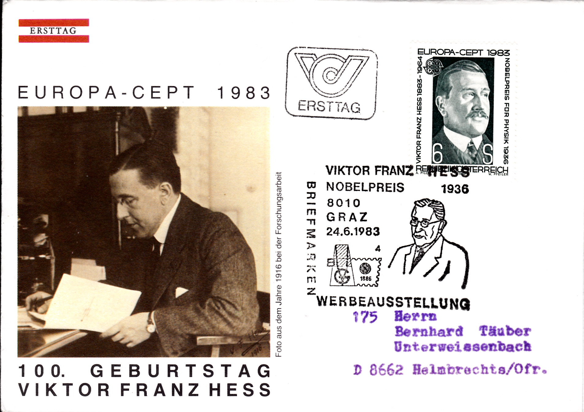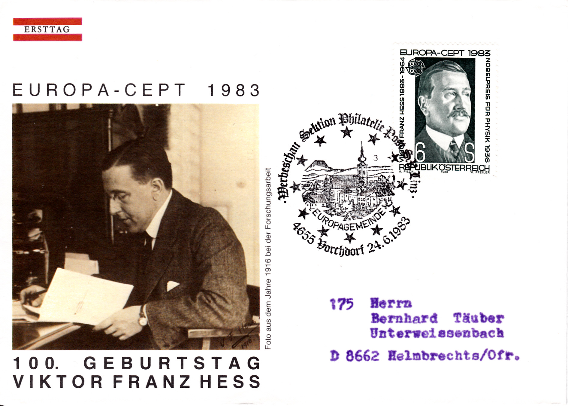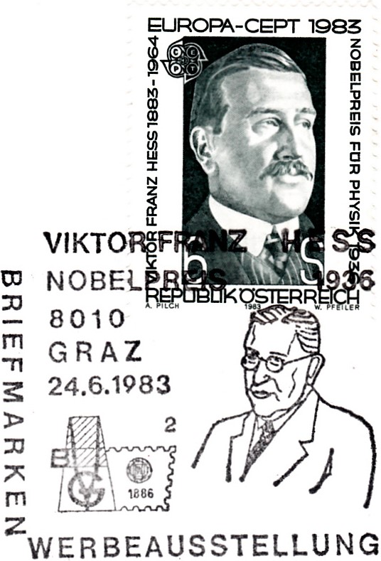 In Österreich erschien die Europamarke 1983 zum Thema "Große Werke des menschlichen Geistes" mit einem Porträt von Viktor Franz Hess.