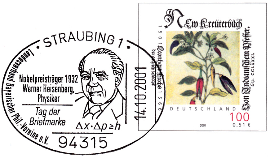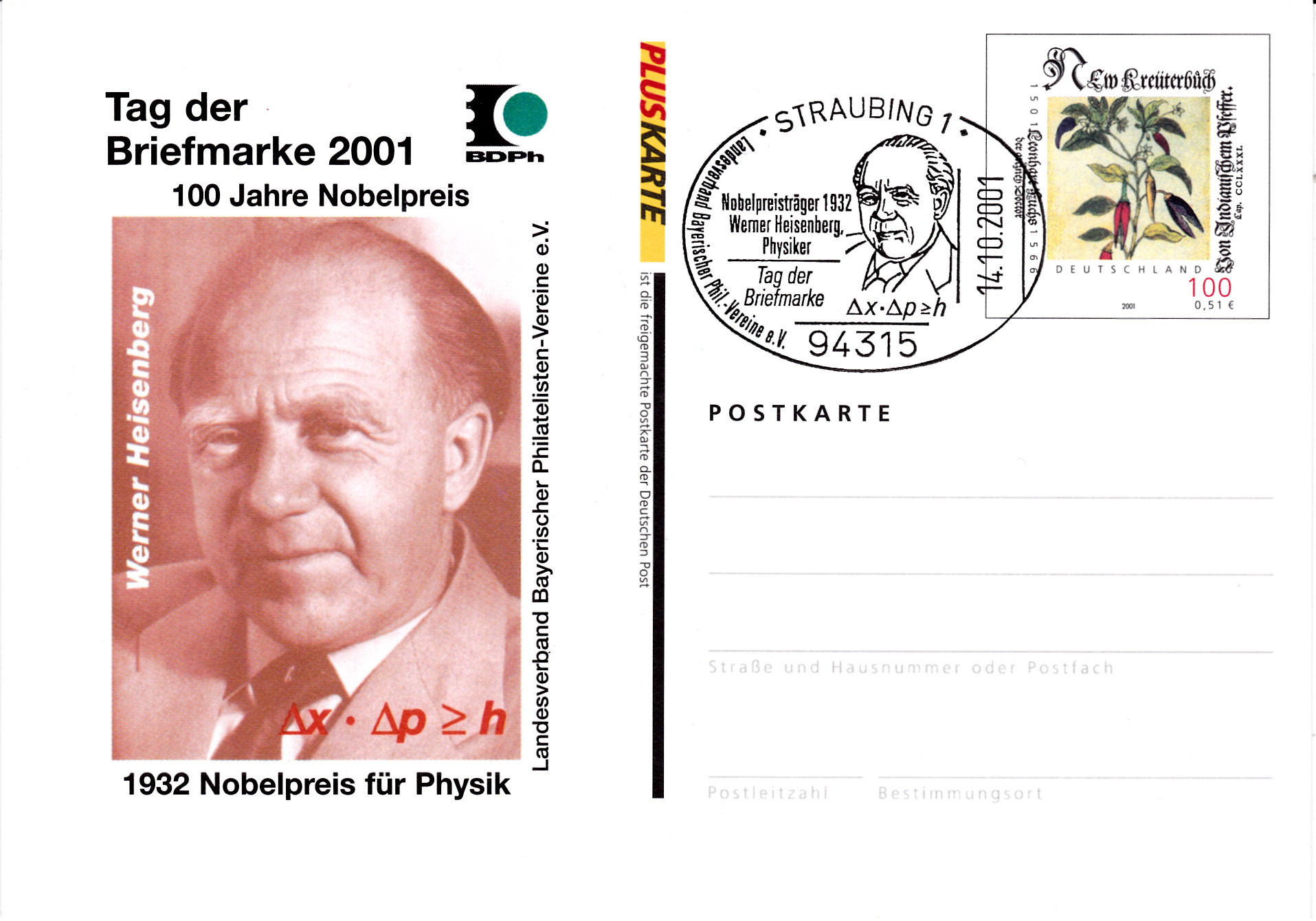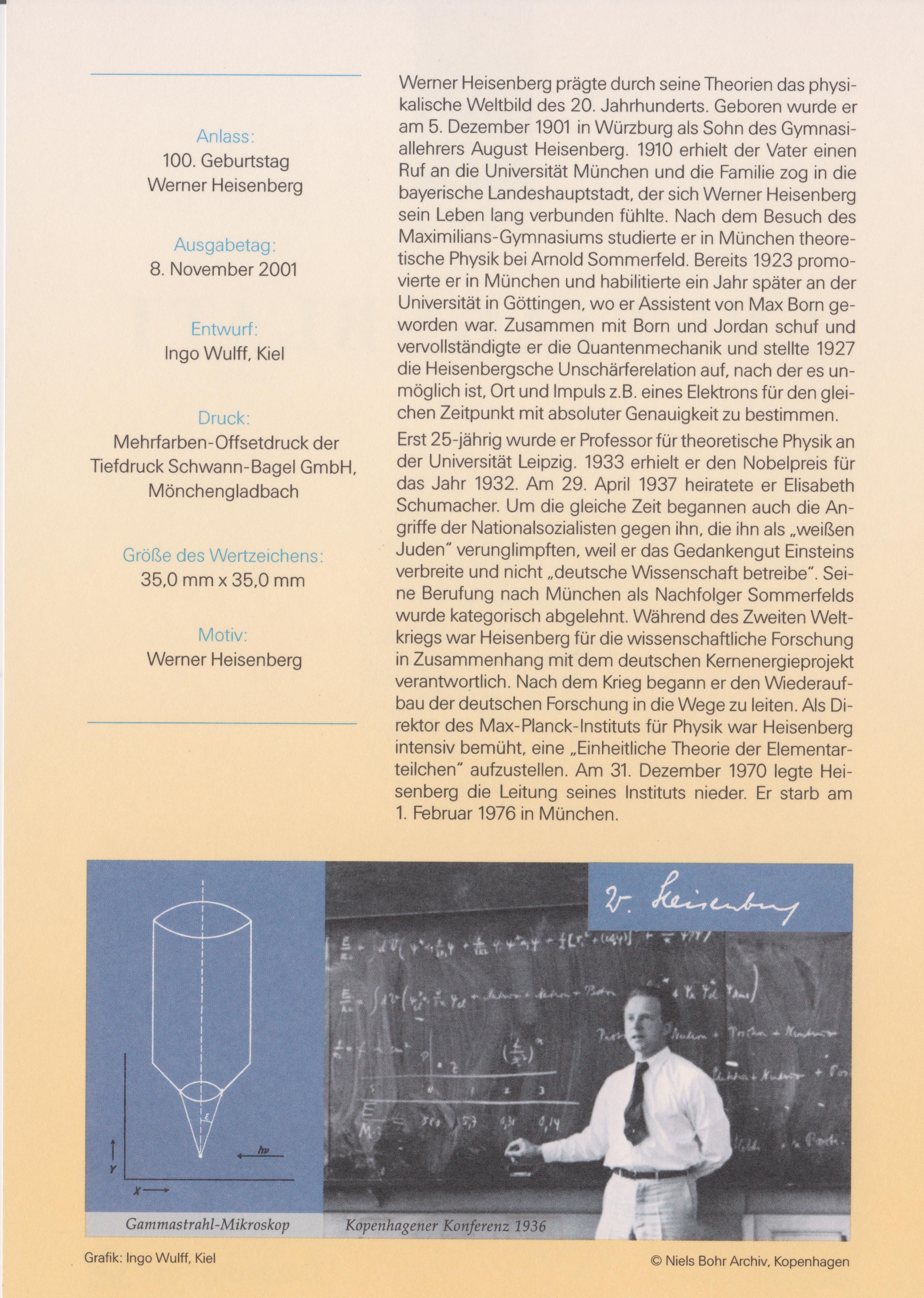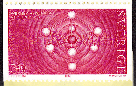 In Schweden erschien 1982 in einem Markenheftchen "Nobelpreisträger für Atomphysik" (MiNr MH 91) auch diese Marke für Werner Heisenberg (MiNr 1218). Die Marke zeigt ein Atommodell nach der Quantentheorie von Werner Heisenberg.