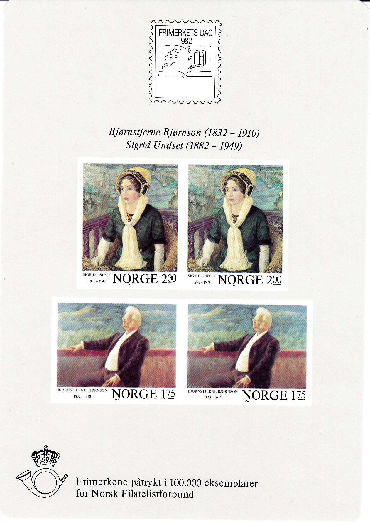 Norwegen verausgabte 1982 einen Block (MiNr Block 4) für den Norwegischen Philatelistenverband zum Tag der Briefmarke mit je zwei Marken (MiNr 871B Sigrid Undset und MiNr MiNr 870B Björnstjerne Björnsen, ebenfalls Schriftsteller).